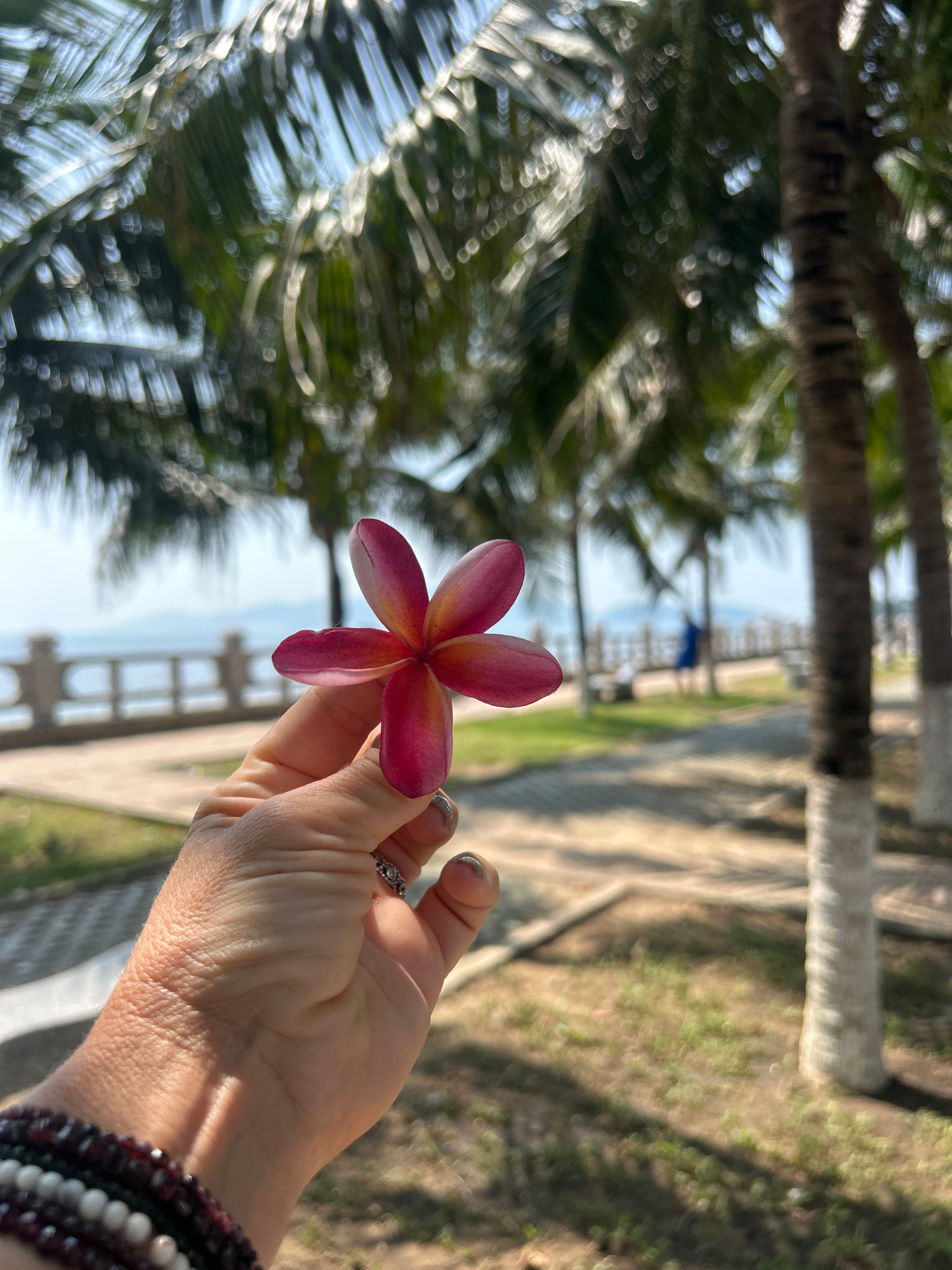 A hand, presumably female, holds a vibrant plumeria (frangipani) flower against a tropical, out-of-focus background. The flower features petals that transition from deep pink at the edges to a lighter…read more