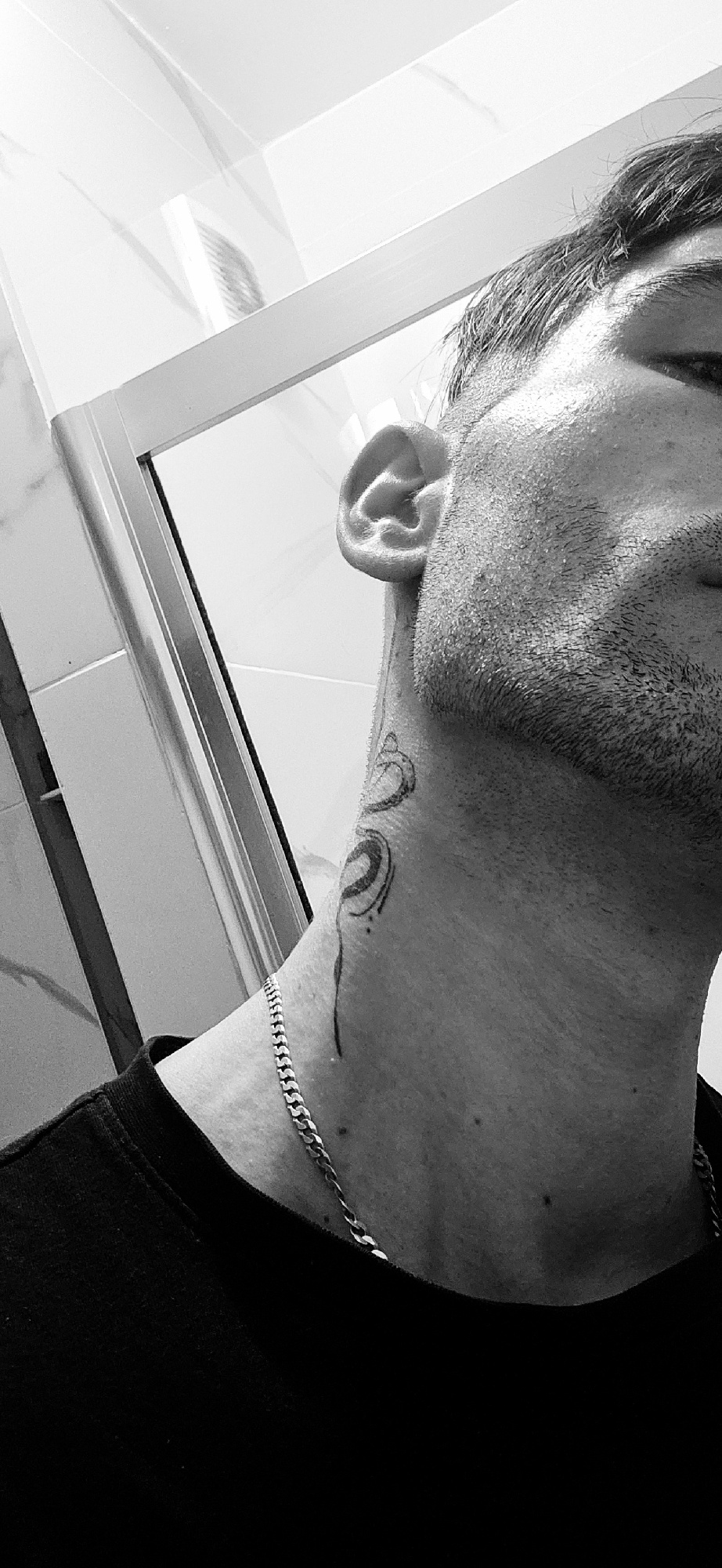 This black and white, high-contrast image presents a close-up, low-angle perspective of a person's upper body and head, likely taken in a modern indoor setting, possibly a bathroom in Plovdiv, Bulgari…read more
