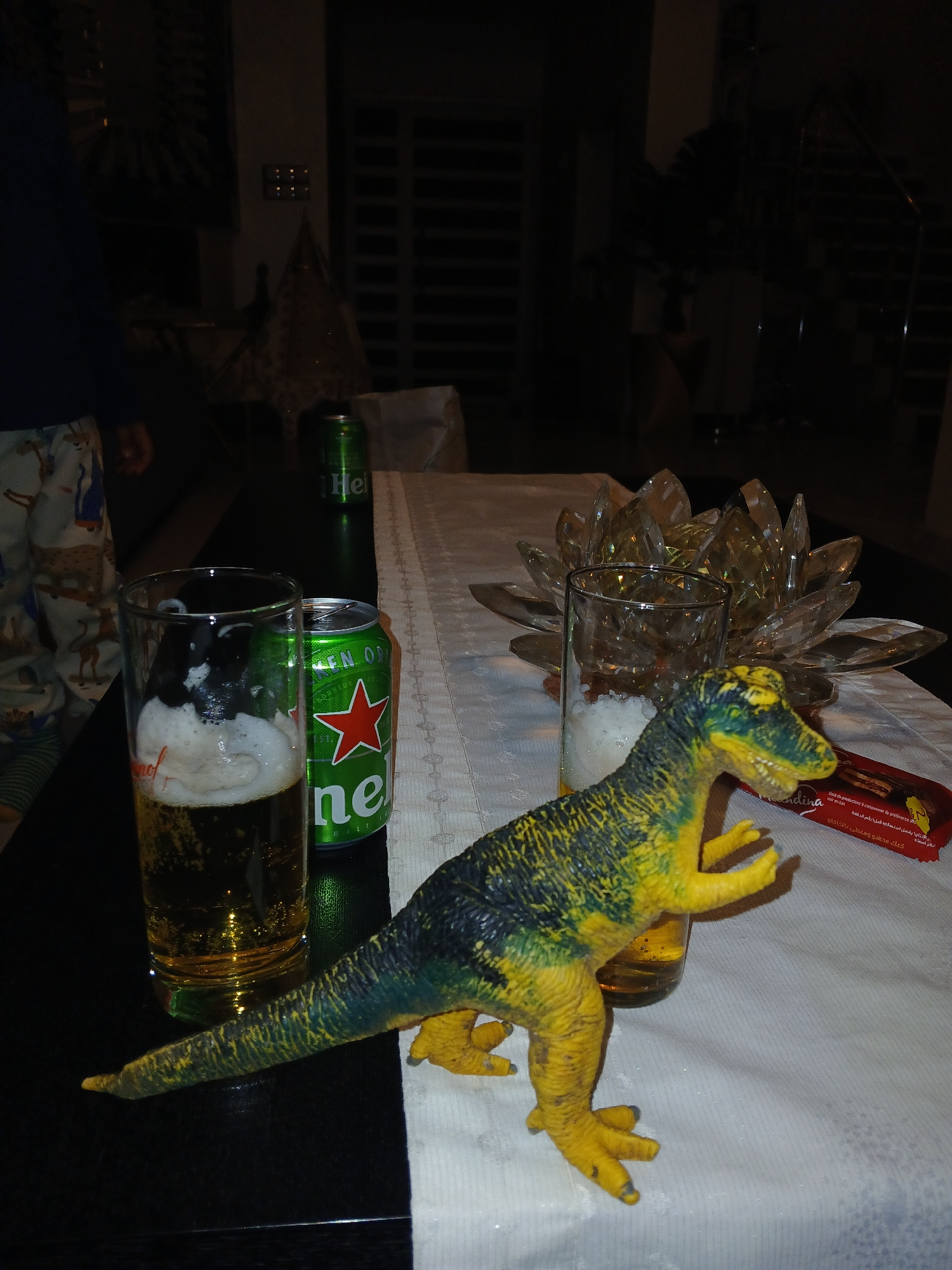 The image shows a table setting with a dinosaur toy, a beer bottle and glass, and a package of cake. The bottle is a Heineken. The cake is labeled in Arabic. The scene is indoors and the table has a r…read more