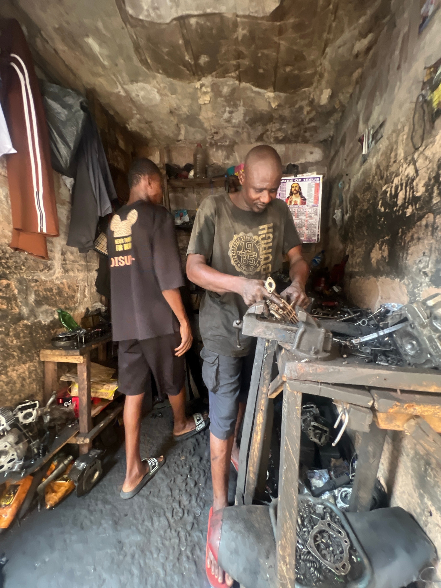 The image depicts two adult Black men in a cluttered, poorly lit workshop in Onitsha, Nigeria. The older man, wearing a dark t-shirt with gold lettering, is working on a motorcycle engine clamped in a…read more