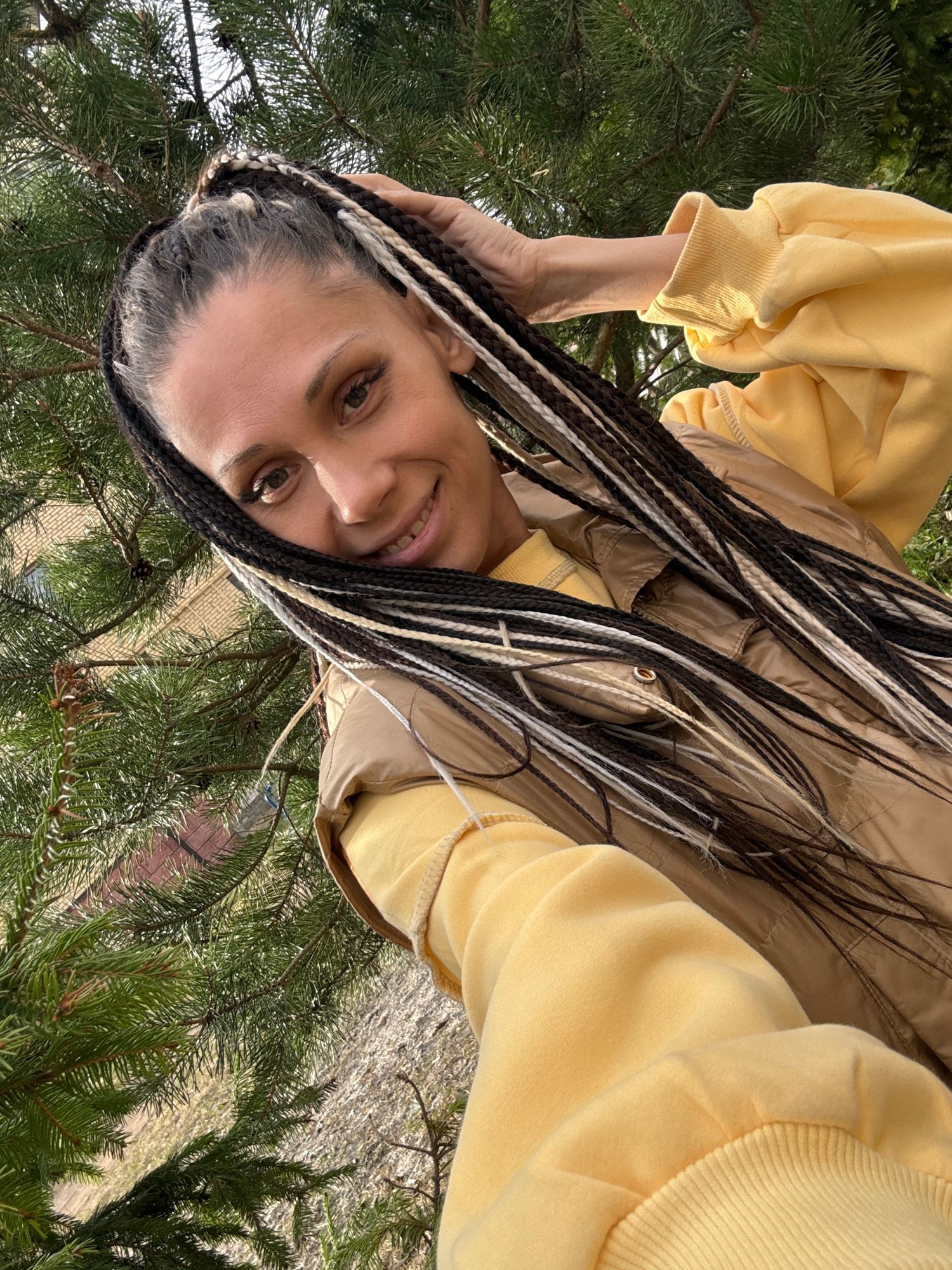 A middle-aged woman with black and white braids is posing for a selfie outdoors, possibly in Rusanovo, Russia. She is wearing a yellow sweatshirt and a light brown vest. She is smiling slightly. The b…read more