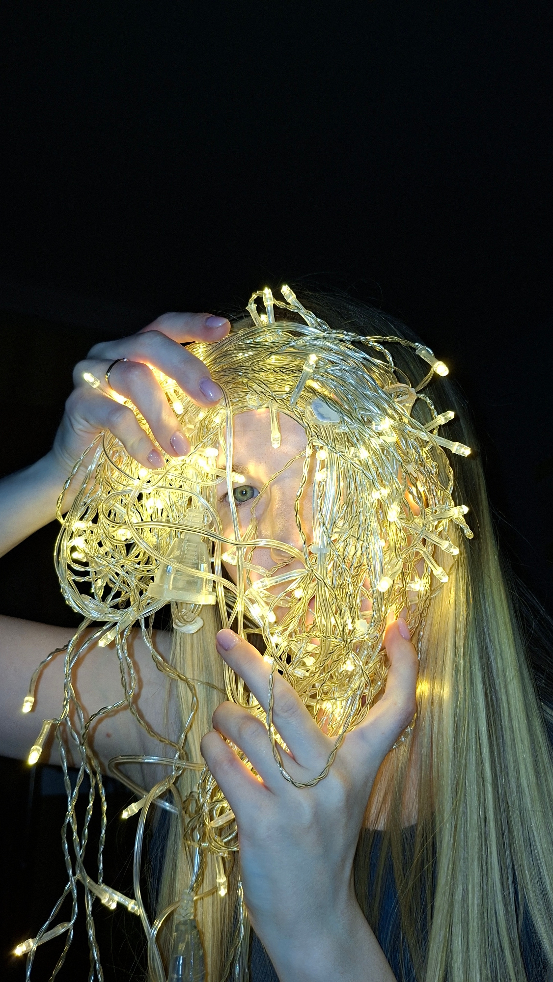 A woman with light blonde hair is holding a large tangle of warm white fairy lights in front of her face. Her eyes are visible through the lights. The background is dark. The location is not discernib…read more