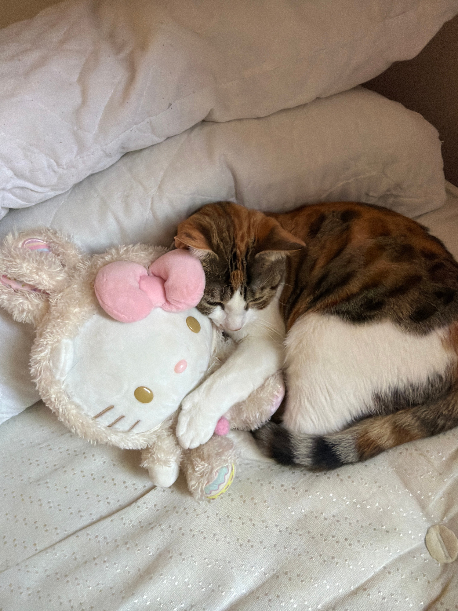 A calico cat is curled up asleep on a plush Hello Kitty toy, which is lying on a white bed. The cat is positioned on the left side of the frame and is resting its head on the pink bow of the Hello Kit…read more