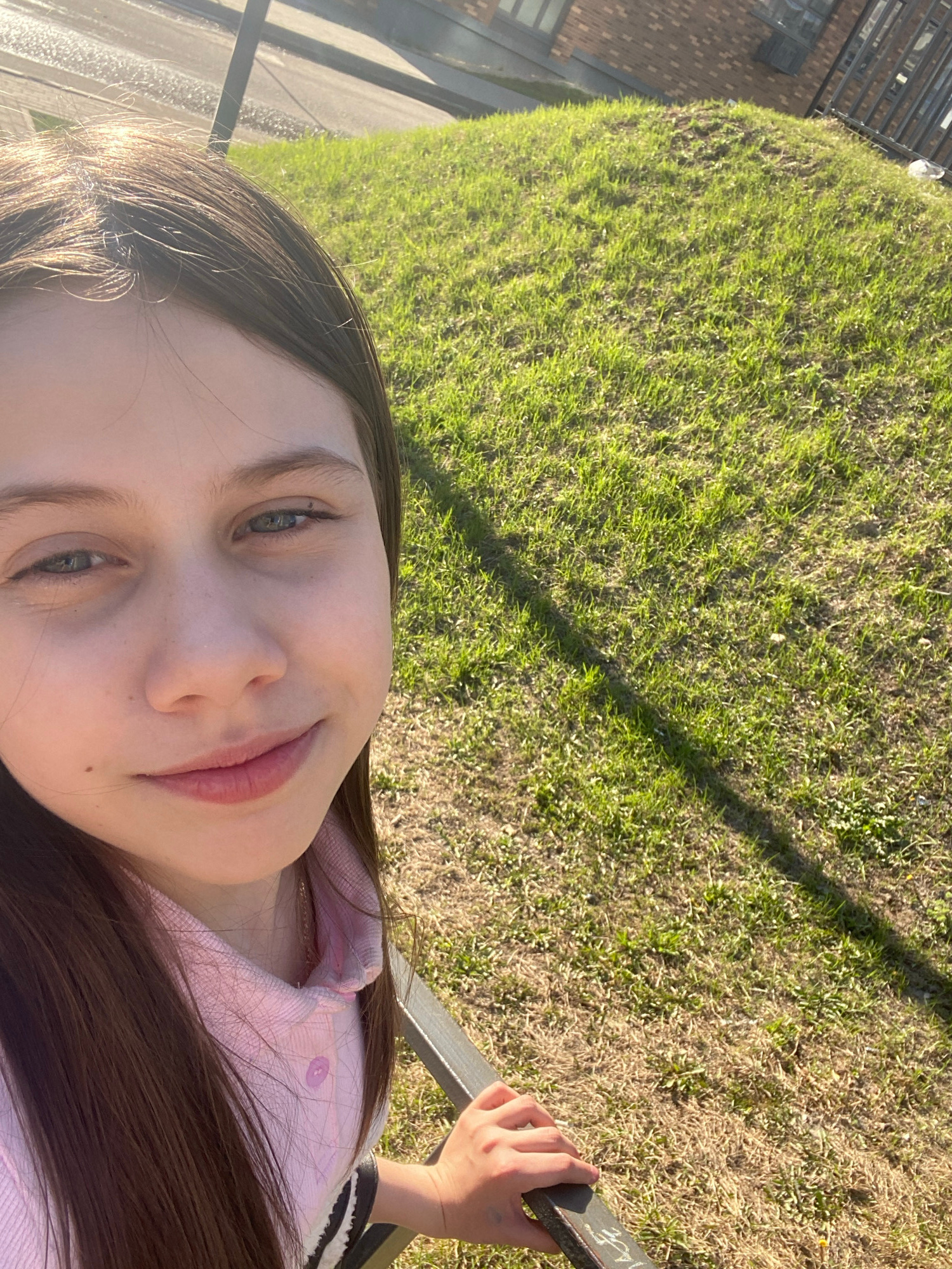 A young woman is depicted taking a selfie outdoors in Izhevsk, Russia. The image is rotated 90 degrees counter-clockwise. Her face, seen from a slightly low angle, features light skin, light blue-gree…read more