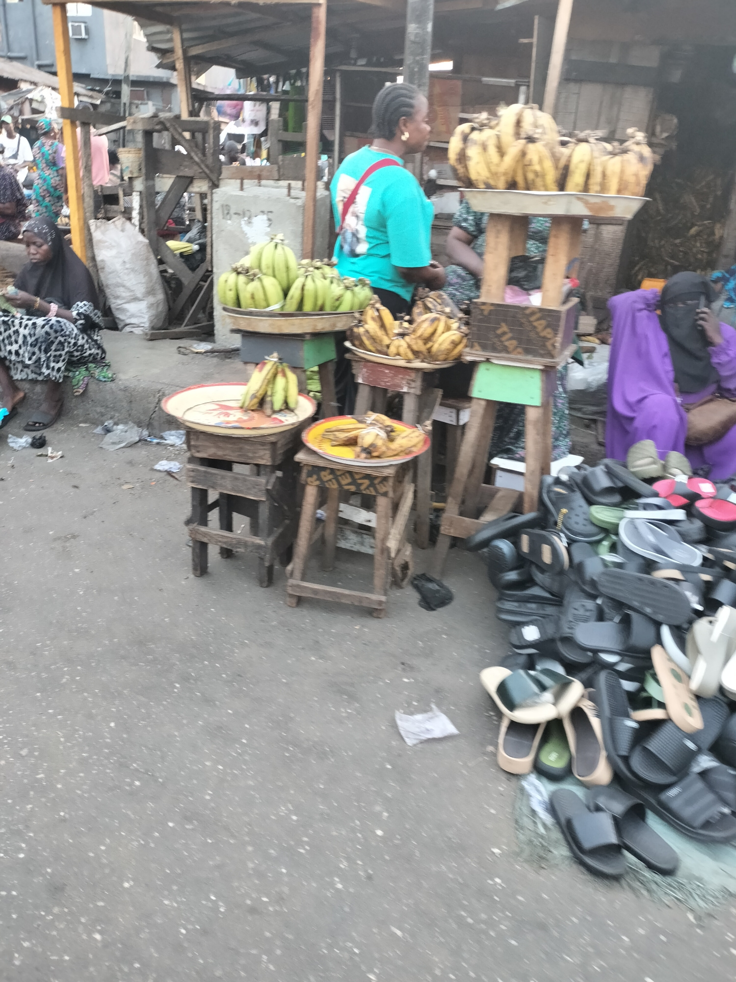 The image shows a street scene in Lagos, Nigeria, likely a marketplace. Several vendors are visible. One vendor wears a turquoise shirt and stands behind a table with ripe plantains. Another vendor, d…read more