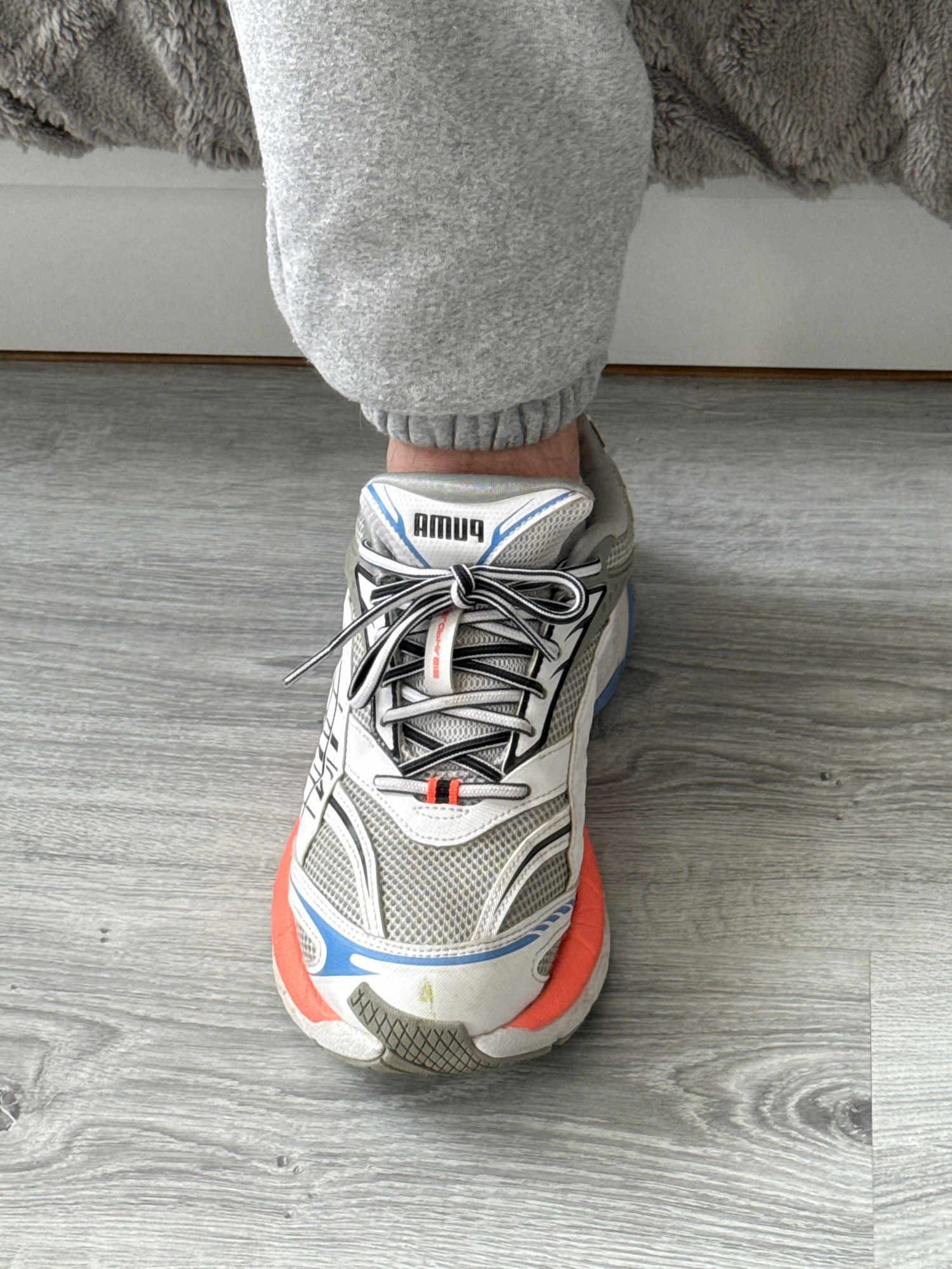 A photograph depicts a person's leg, clad in grey sweatpants, with a white and grey running shoe on the foot. The shoe has black and white striped laces and orange and blue detailing. The word "AMU4"…read more
