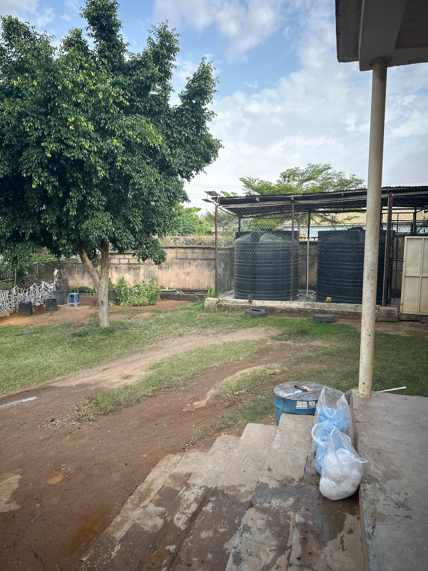 This image shows a scene in Jos, Nigeria, likely in a semi-urban or industrial area. In the foreground, there is a concrete structure with steps, upon which lie several plastic bags filled with materi…read more