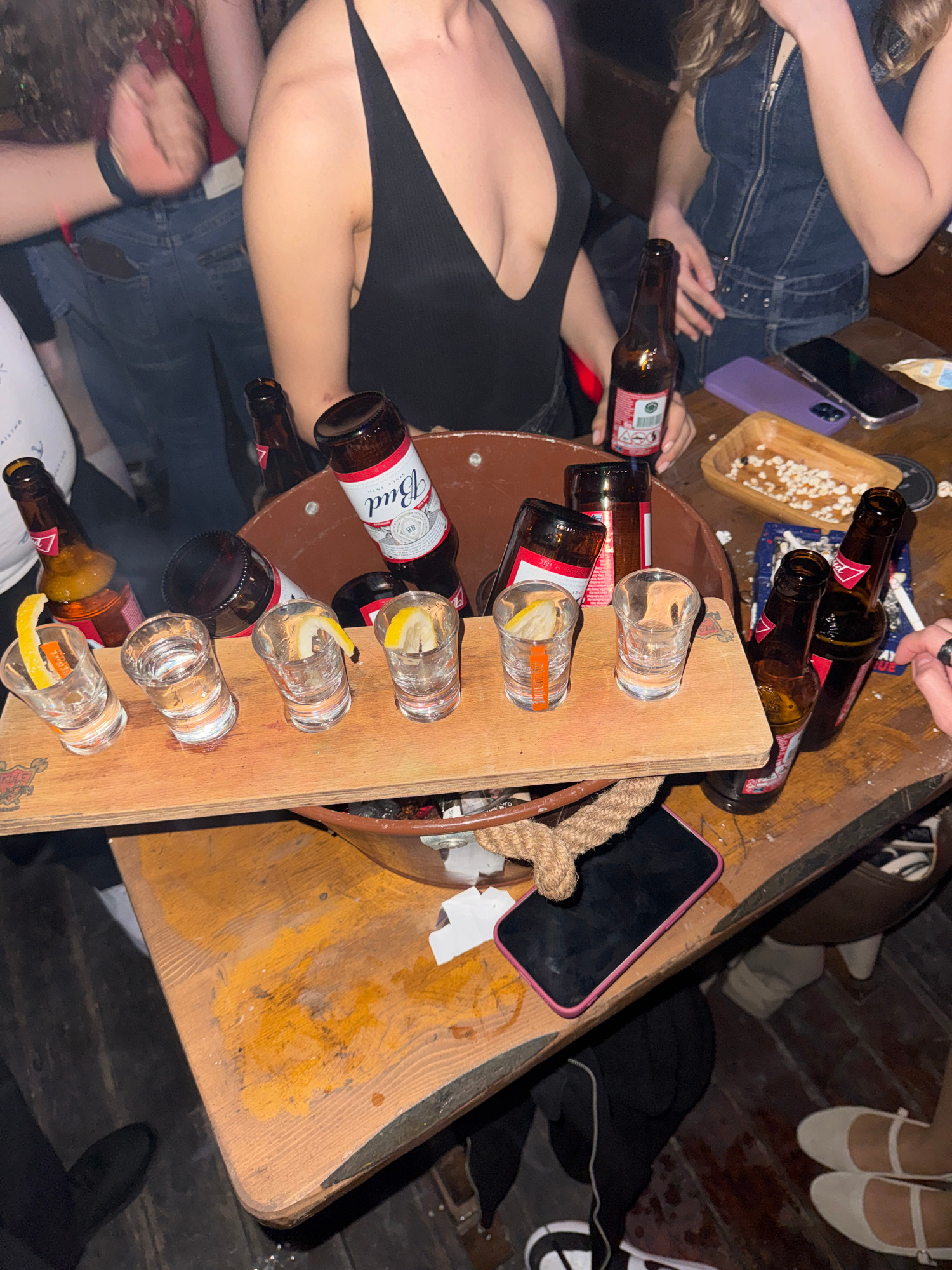 The image captures a high-angle shot of a social gathering, seemingly indoors, with a focus on a wooden table covered with various items. Several individuals are partially visible around the table, su…read more