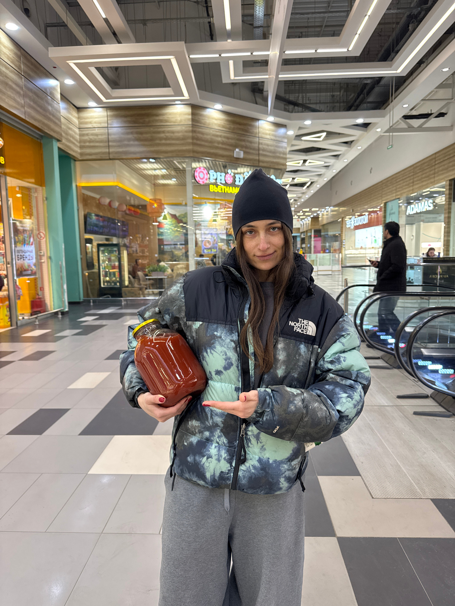 A woman is indoors, likely in a shopping mall in Moscow, Russia. She wears a black beanie, a patterned puffer jacket with "THE NORTH FACE" visible, and gray sweatpants. She holds a large, dark-colored…read more