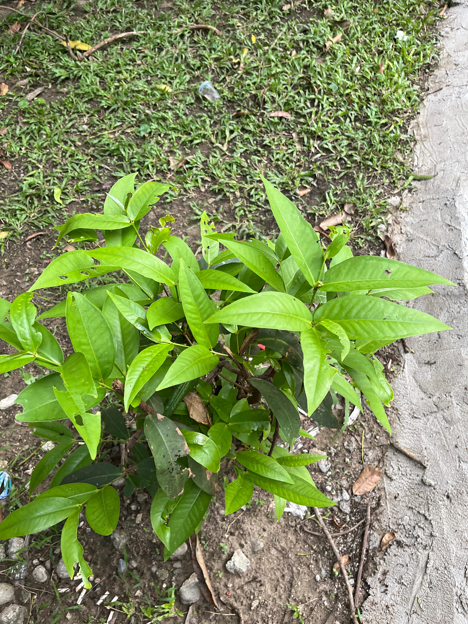 A medium-angle, outdoor shot depicts a green plant with long, pointed leaves, positioned in an area where grass meets a patch of bare ground with scattered rocks and debris, adjacent to a concrete str…read more