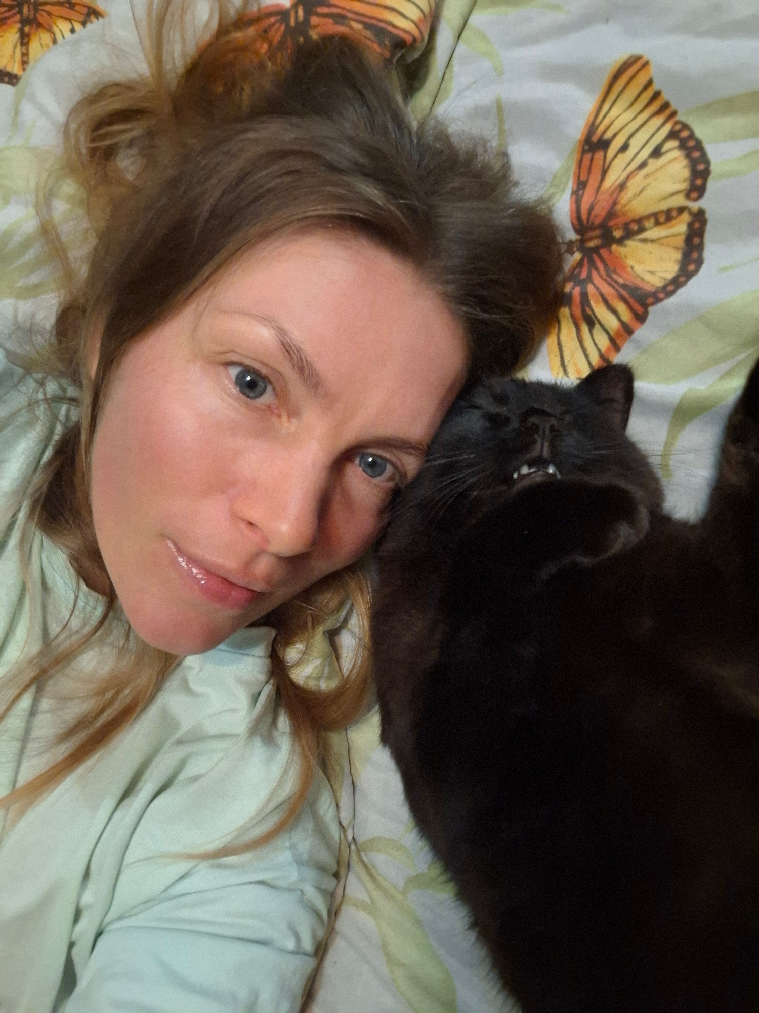 A woman is lying on a bed with a black cat on her head. The woman is fair-skinned with light eyes and light brown hair. She is wearing a light-colored shirt. The black cat is lying on the woman's head…read more