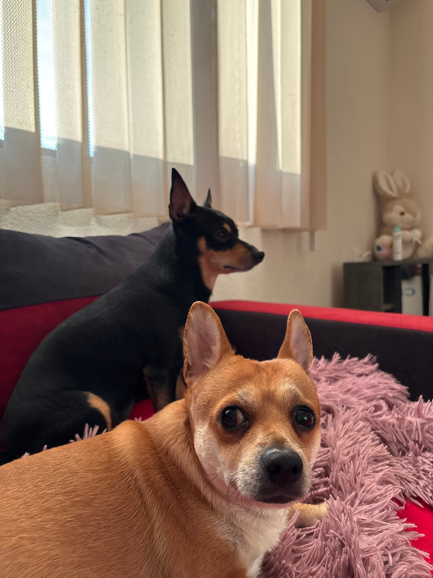 Two dogs are on a bed. One is brown and looking directly at the camera, while the other is black and tan and looking upwards towards a window. The bed has a grey sheet and a red pillow. There is a pur…read more