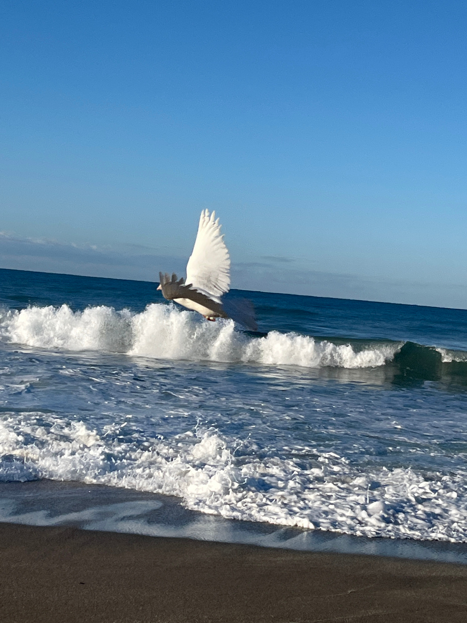 The photograph captures a coastal scene, likely taken on a beach in Alanya, Turkey. The sky is a clear, bright blue, contrasting sharply with the deep blue hues of the ocean. Waves are crashing onto t…read more