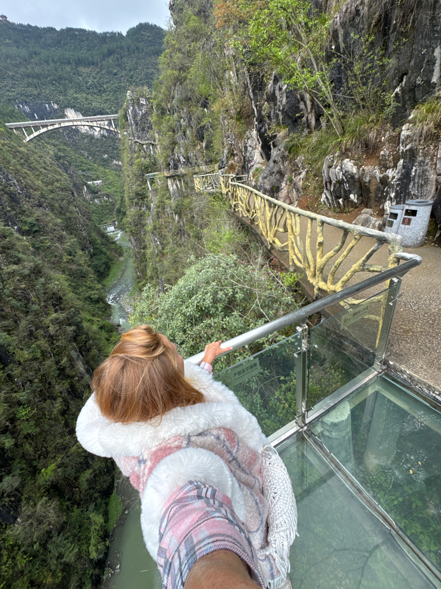 A woman is seen from above, standing on a glass-bottomed platform or bridge. She wears a white, fuzzy hooded jacket over a pink-and-white plaid shirt or blanket, and her brown hair is pulled back into…read more