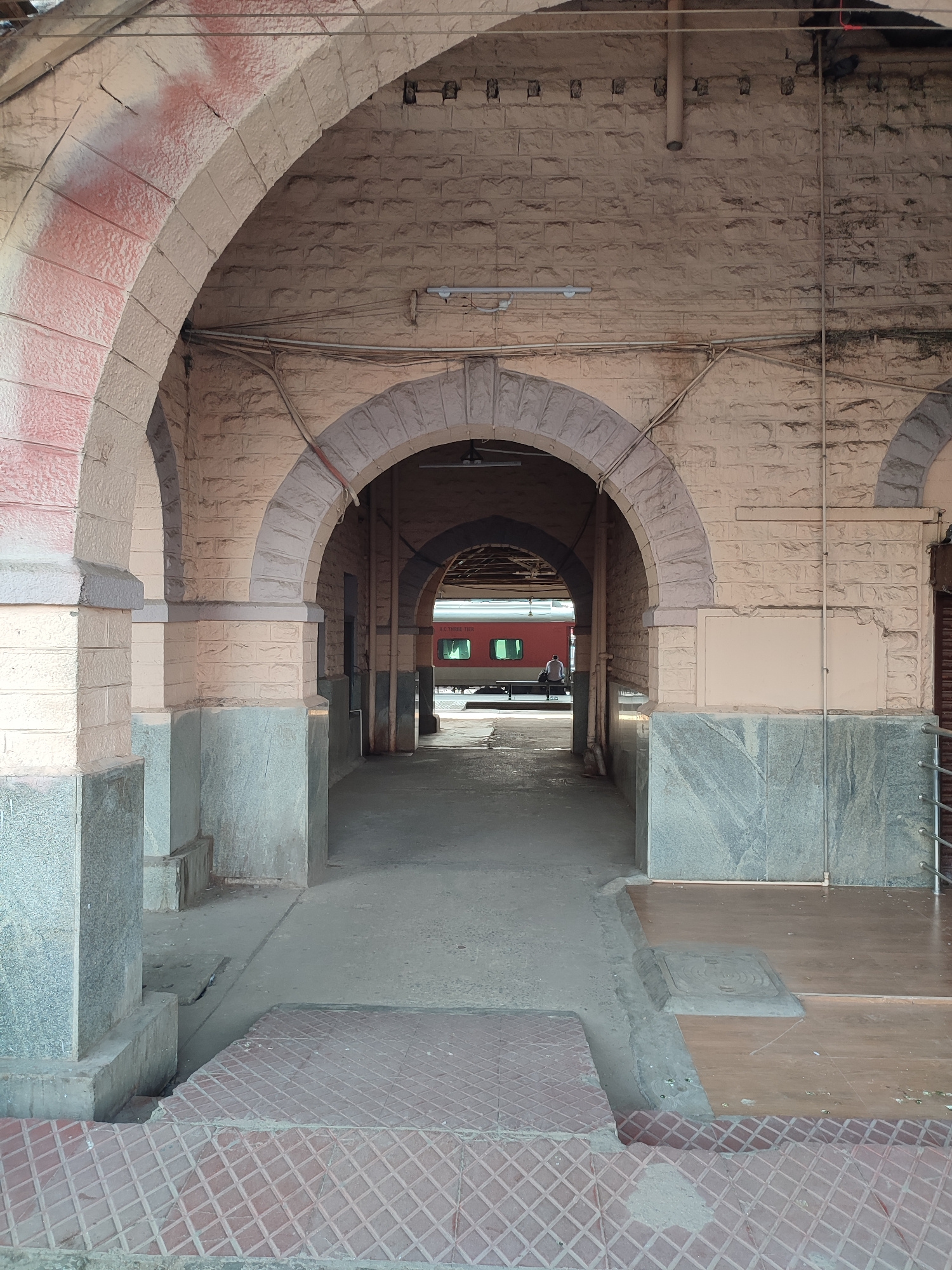 The image shows a view through a series of arched stone passages in a building, likely a train station platform in Unknown, Unknown. The arches are constructed from light-colored stone, with some havi…read more