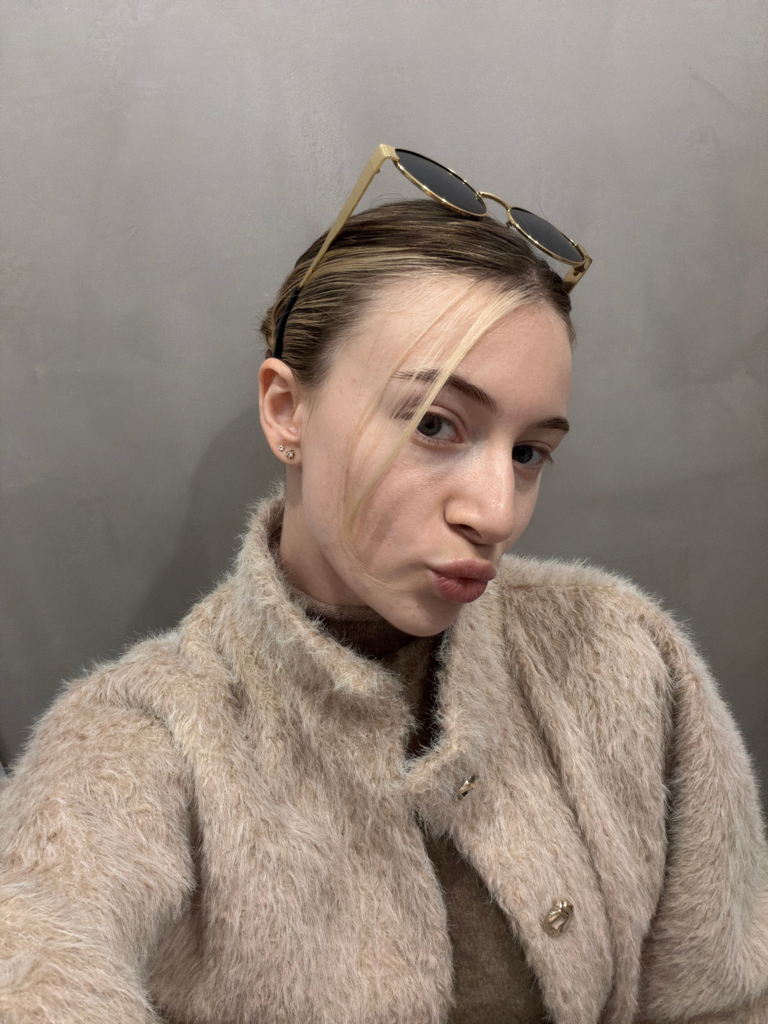 A young woman is posing for a selfie indoors against a plain gray wall. She has fair skin, light brown hair with a blonde streak, and is wearing gold-rimmed sunglasses pushed up on her head. Her lips…read more