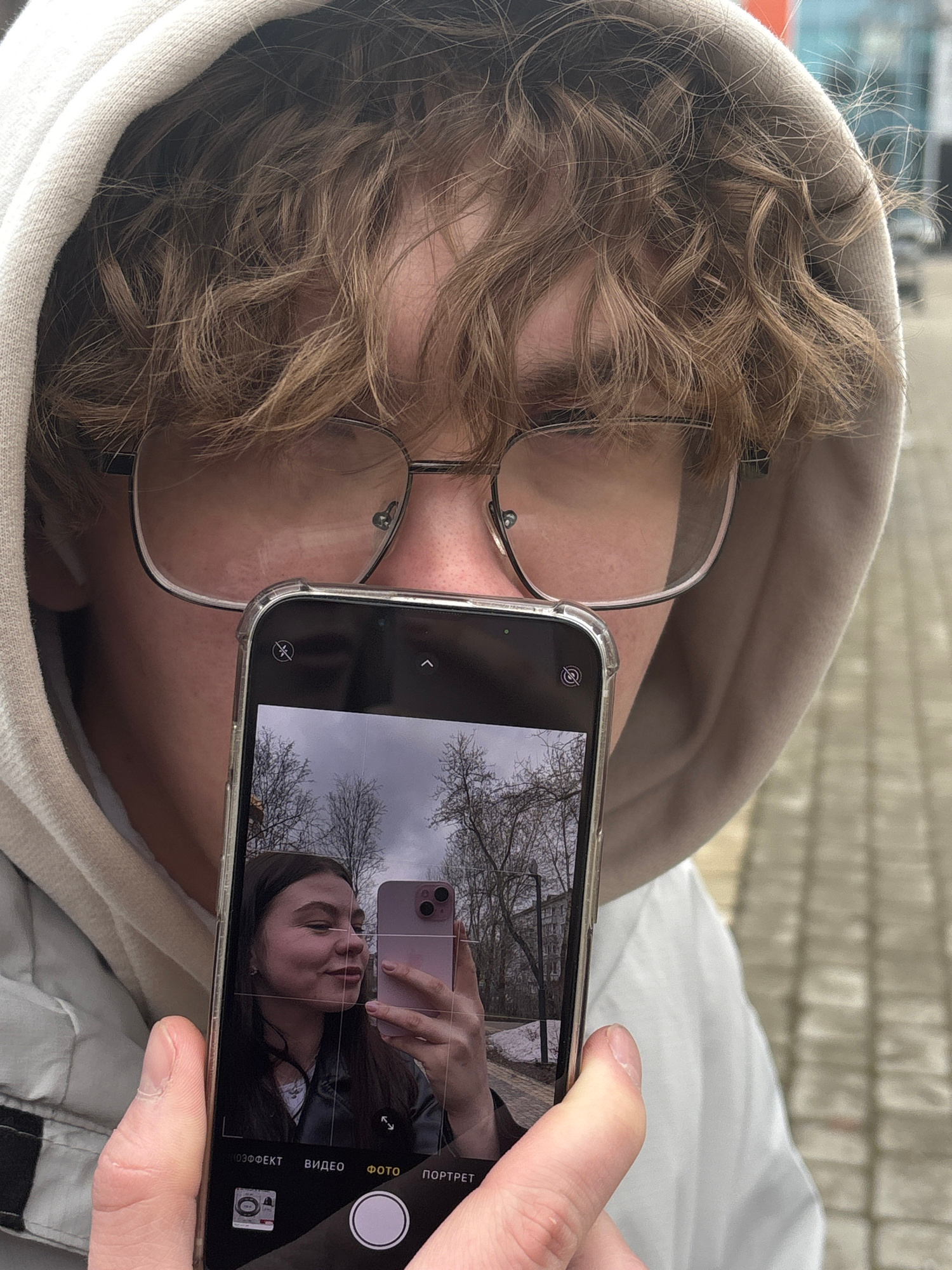 A person with light brown curly hair and glasses, wearing a beige hoodie, is holding a smartphone. The smartphone screen shows the reflection of a woman taking a selfie with a pink smartphone. The bac…read more