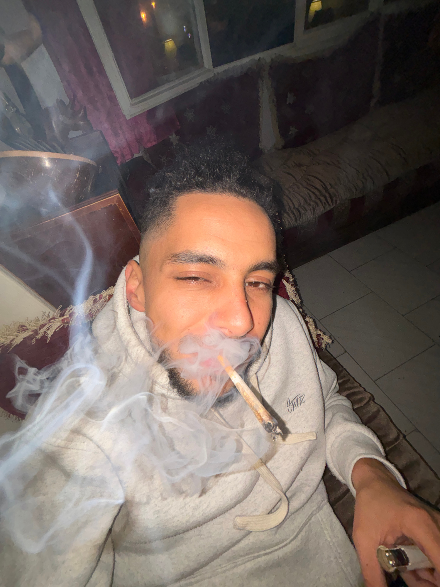 A male individual is depicted in a close-up, chest-up indoor portrait within a residential setting in Tanger, Morocco. He is actively exhaling a dense plume of white smoke from a lit, hand-rolled ciga…read more