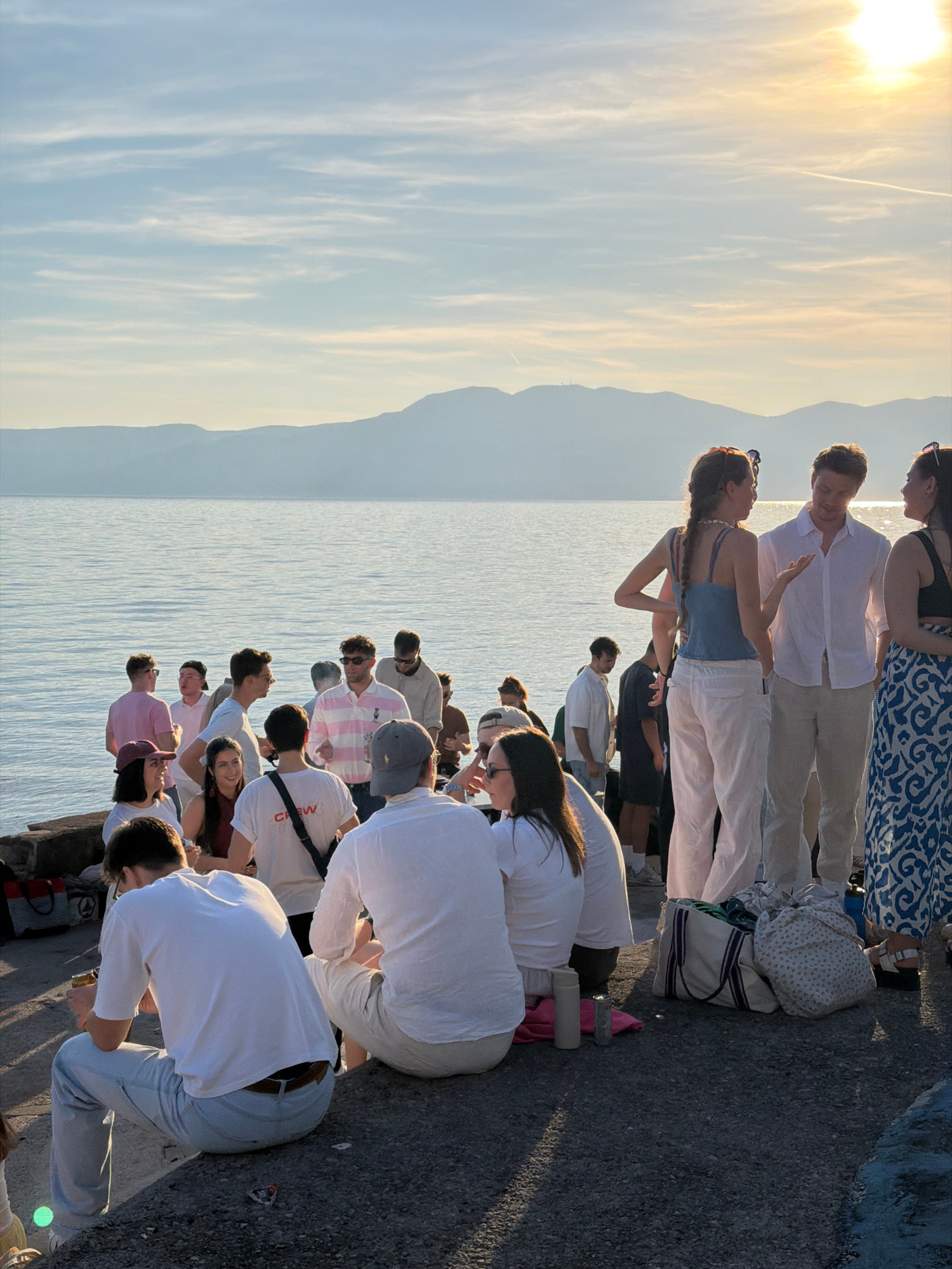 A group of people are gathered on the waterfront in Grad Rijeka, Croatia. They are standing and kneeling near the edge of the water, facing towards the water. Some appear to be interacting with each o…read more