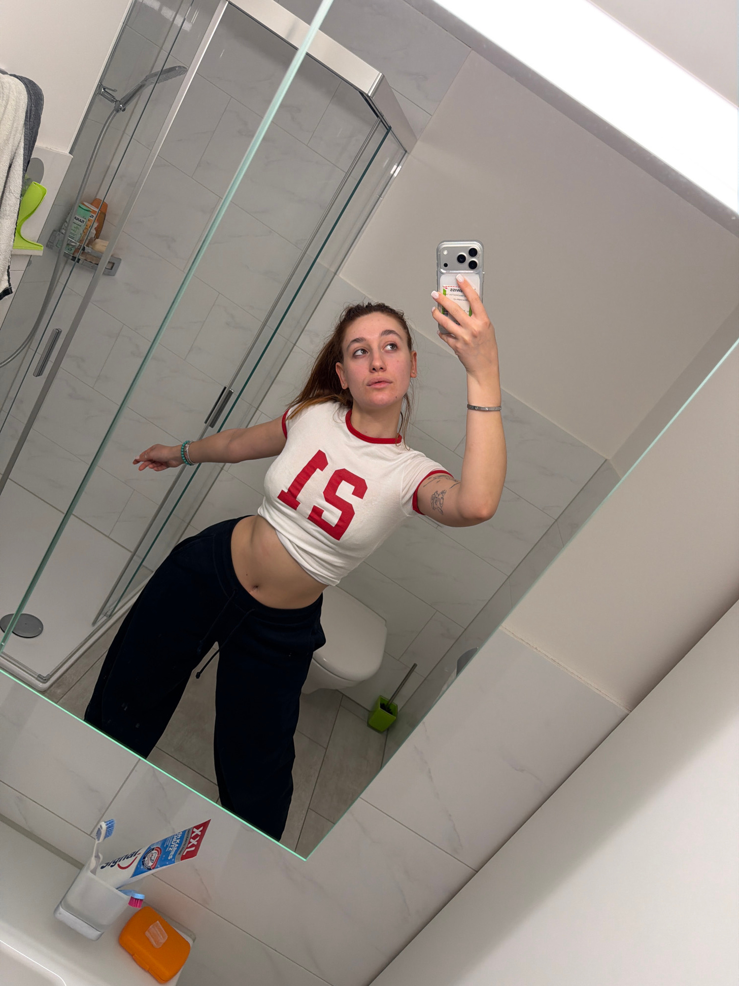 A young woman stands in a modern bathroom with white marble tiles, taking a mirror selfie. She wears a white cropped shirt with a red number "15" and dark sweatpants. Her hair is pulled back. A shower…read more
