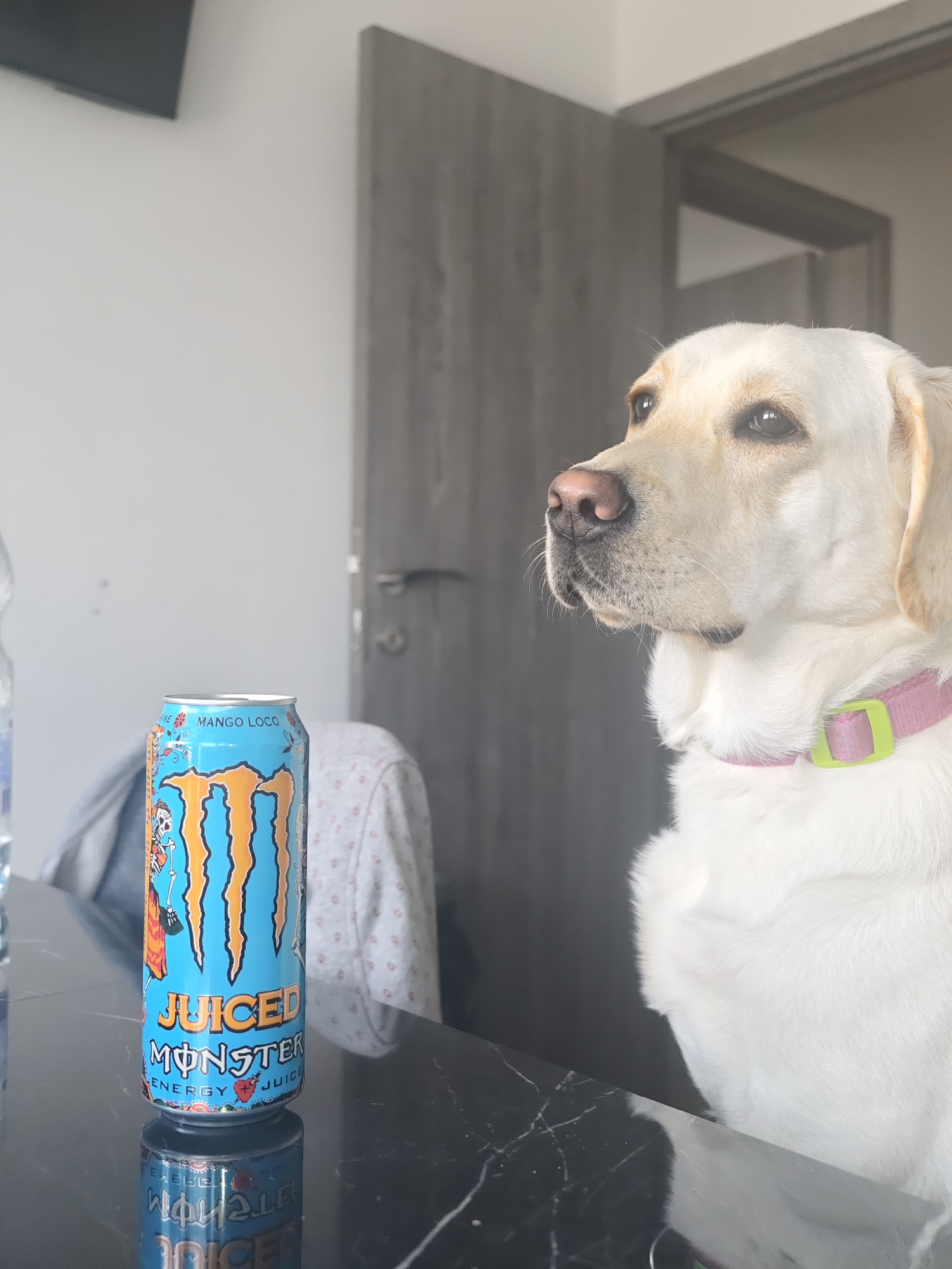 The image depicts a yellow Labrador Retriever dog sitting at a table indoors. On the table is an unopened can of "Juiced Monster" energy drink, Mango Loco flavor, with its reflection visible on the bl…read more