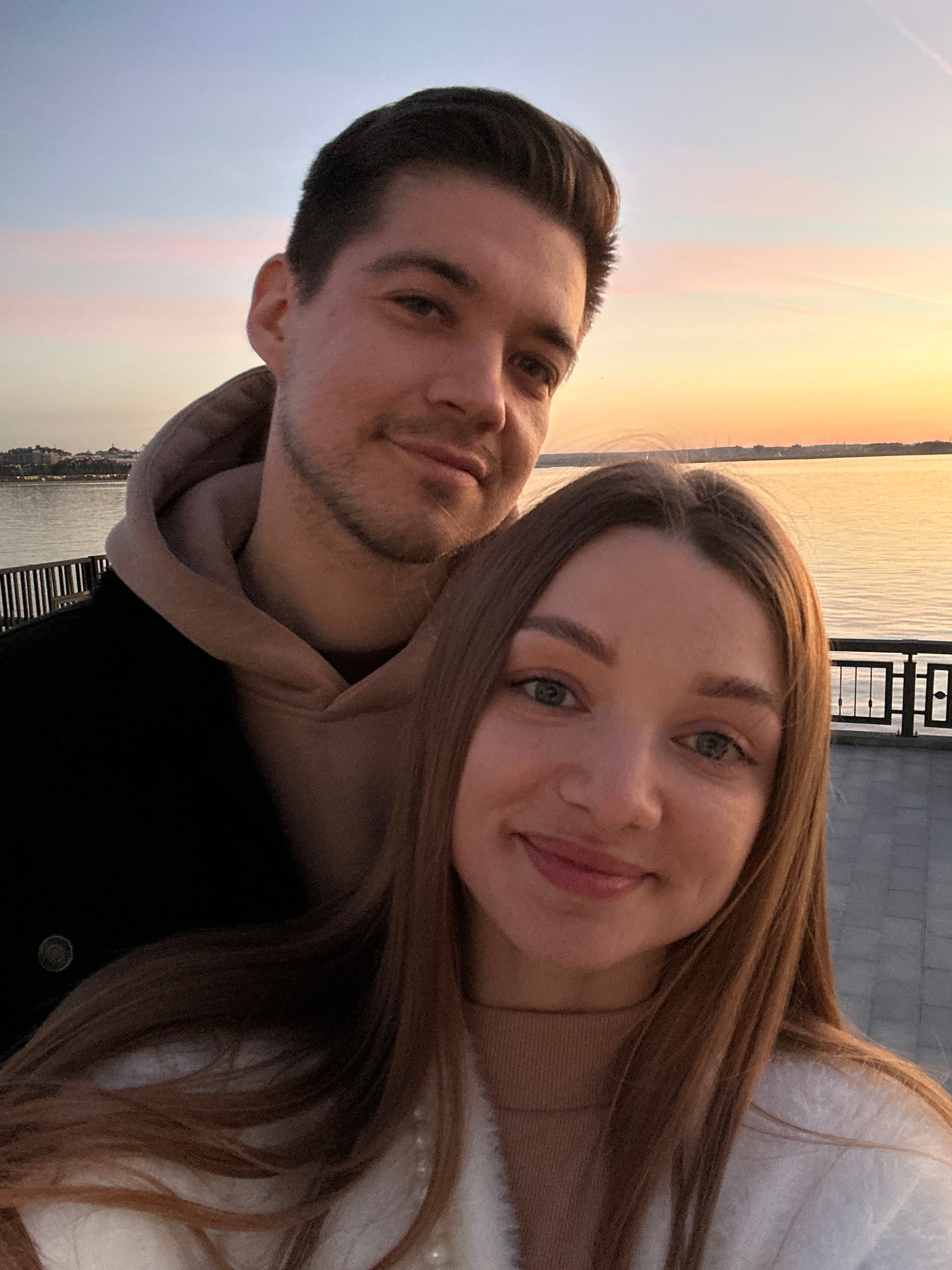 A close-up portrait-oriented image features a man and a woman together, likely a selfie taken against a picturesque waterfront backdrop during sunset or sunrise in Kazan, Russia. The image, originally…read more