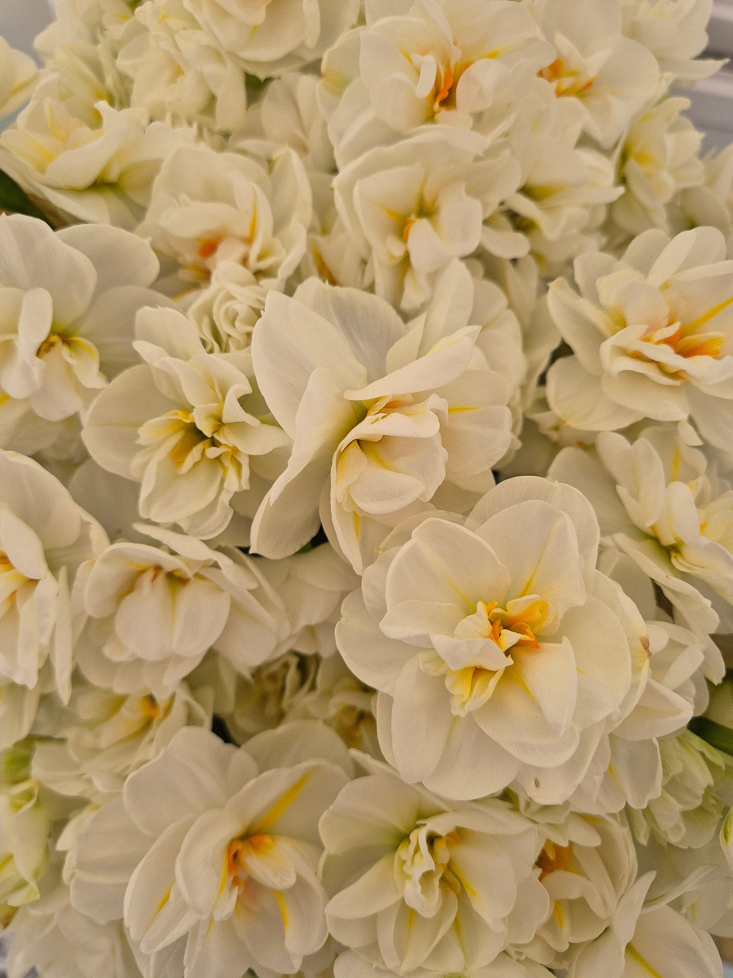 A tight close-up of a cluster of white double daffodil flowers with yellow centers. The petals are densely layered and slightly ruffled. The flowers appear fresh and in full bloom. The location is unk…read more