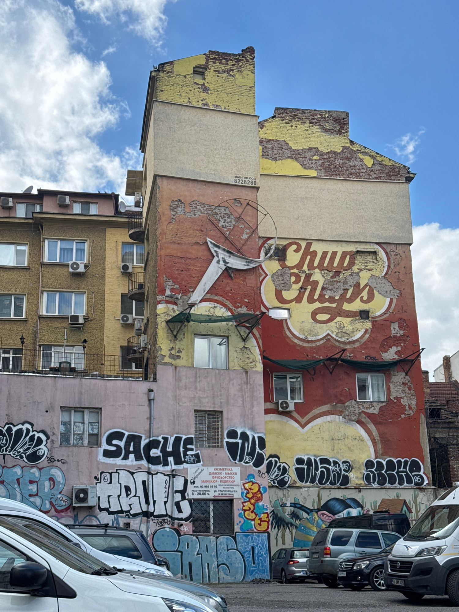 The image shows a colorful, dilapidated building in Sofia, Bulgaria. The building has several floors and is made of brick and concrete. The walls are covered in peeling paint, graffiti, and advertisem…read more