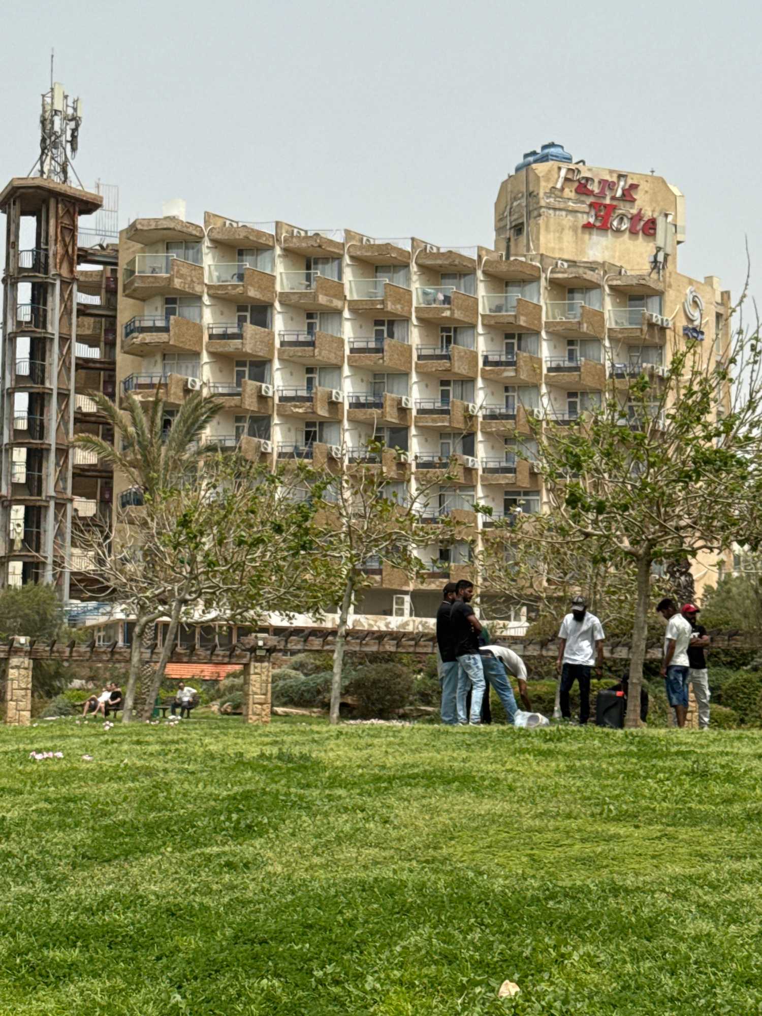 This image, captured in Netanya, Occupied Palestine, depicts an outdoor scene dominated by a multi-story hotel building on the left and a wide expanse of green grass on the right. The most prominent…read more