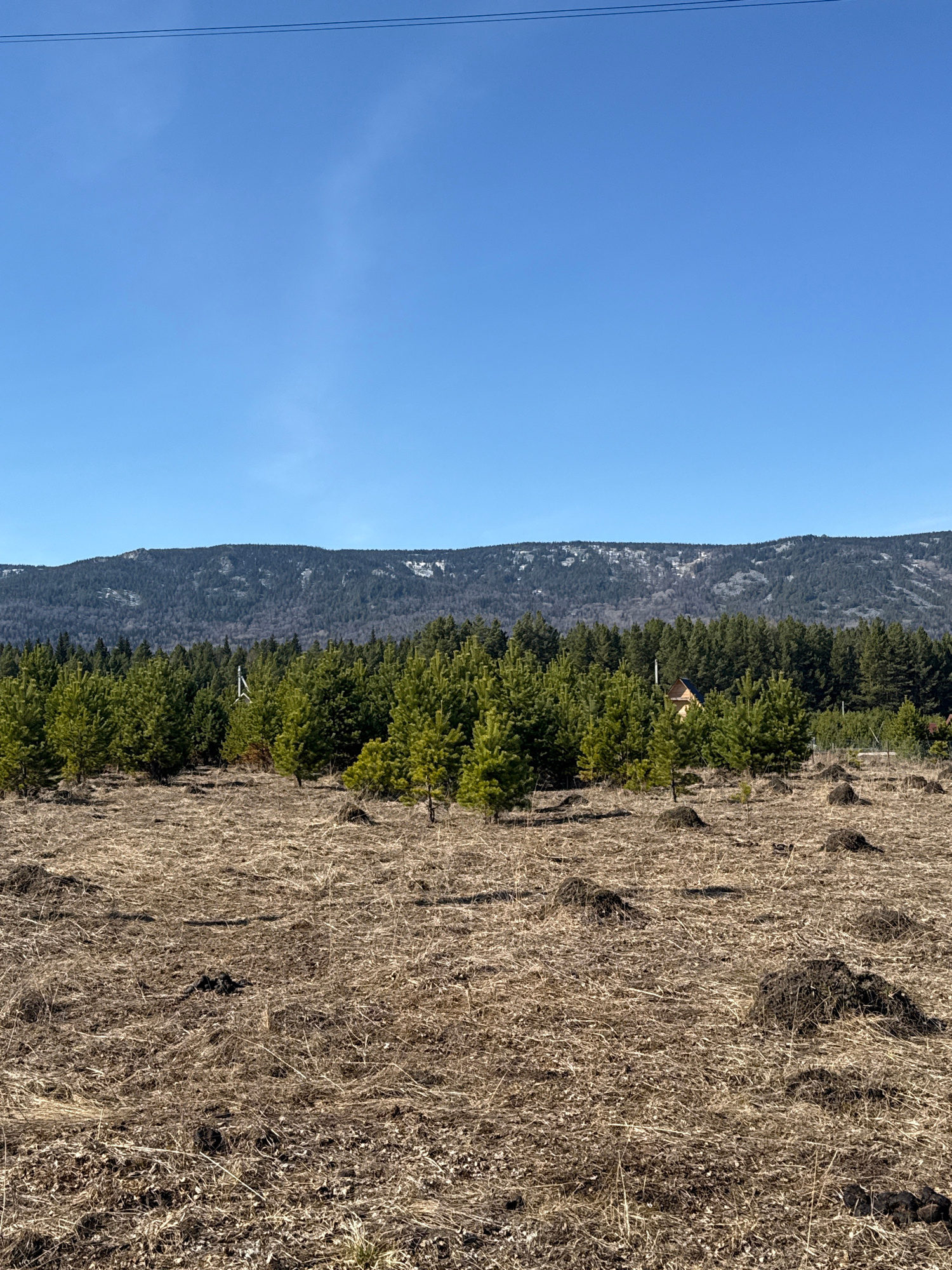 A landscape scene shows a mountain ridge running parallel to a field of dry, brown vegetation. A line of evergreen trees separates the mountain from the field. A small, tan structure is partially visi…read more