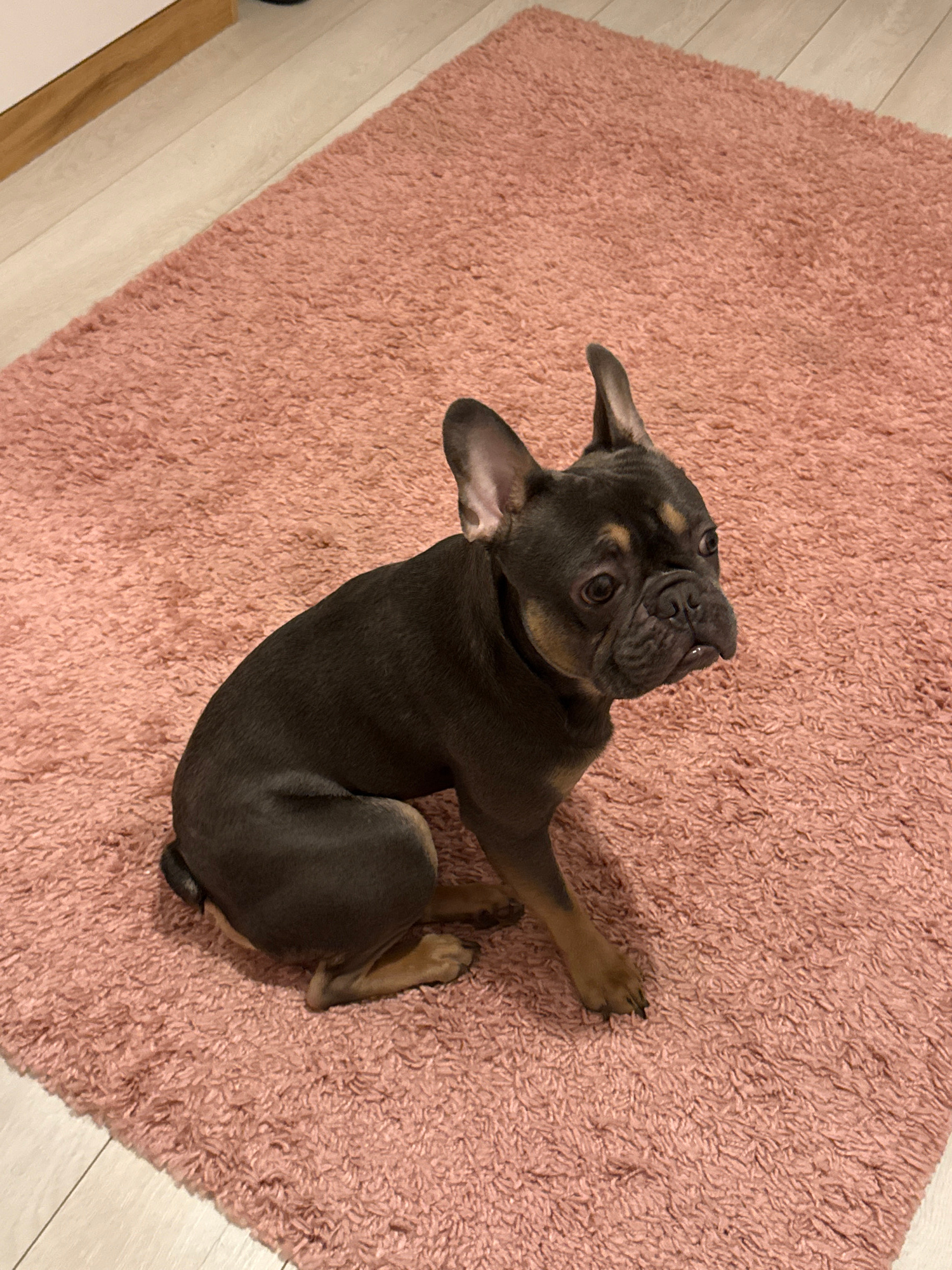 A blue brindle French Bulldog sits on a pink shag rug. The dog's head is tilted upwards, looking at the camera. The rug is partially on a light-colored wood floor. The location cannot be determined fr…read more