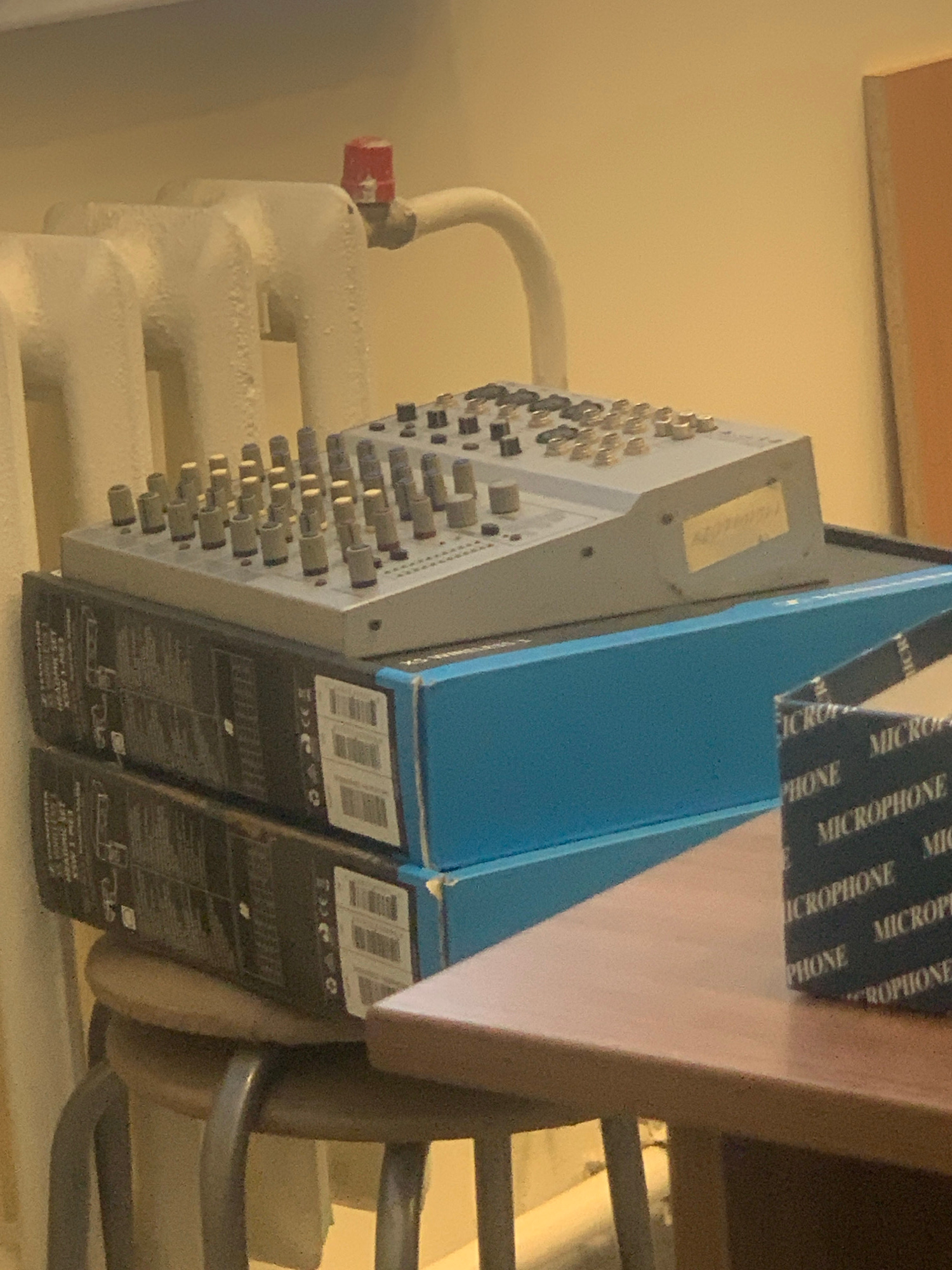 The image depicts two boxes labeled "Microphone" next to a mixing console, with the console appearing to rest on a white radiator. The setting is not specified or identifiable as being in Chaikovsky,…read more