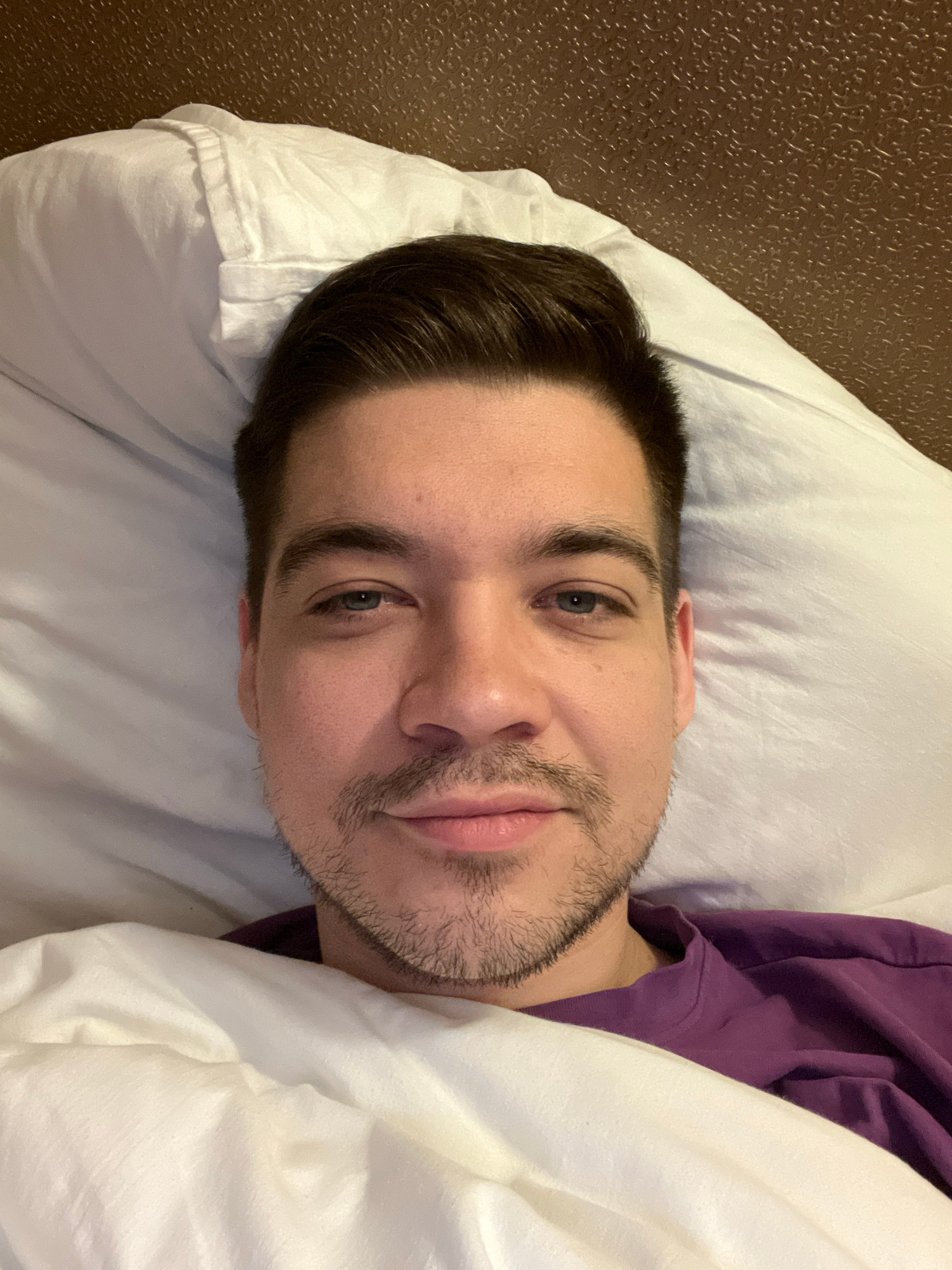 A Caucasian male is lying on a white pillow and covered with a white blanket. He has short, dark hair and a light beard. He's wearing a purple shirt. The background appears to be a textured brown wall…read more