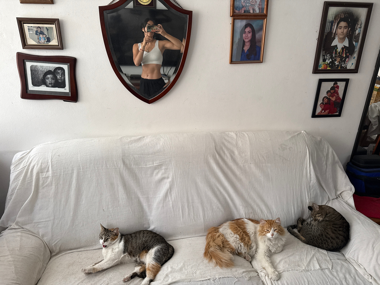 The image depicts an interior setting, likely a living room in Puebla, Mexico. A white sofa covered with a white sheet dominates the foreground. Three cats are present on the sofa: one gray and white…read more