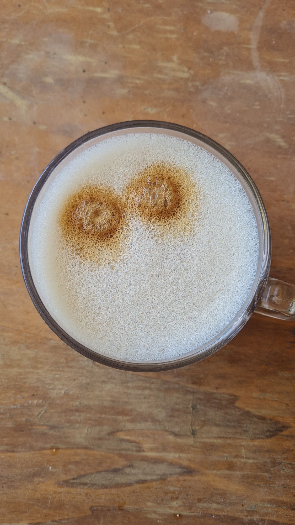 A close-up, overhead shot depicts a glass mug filled with foamy coffee, likely a cappuccino or latte, resting on a wooden surface. The coffee exhibits a light brown and white color gradient with two d…read more