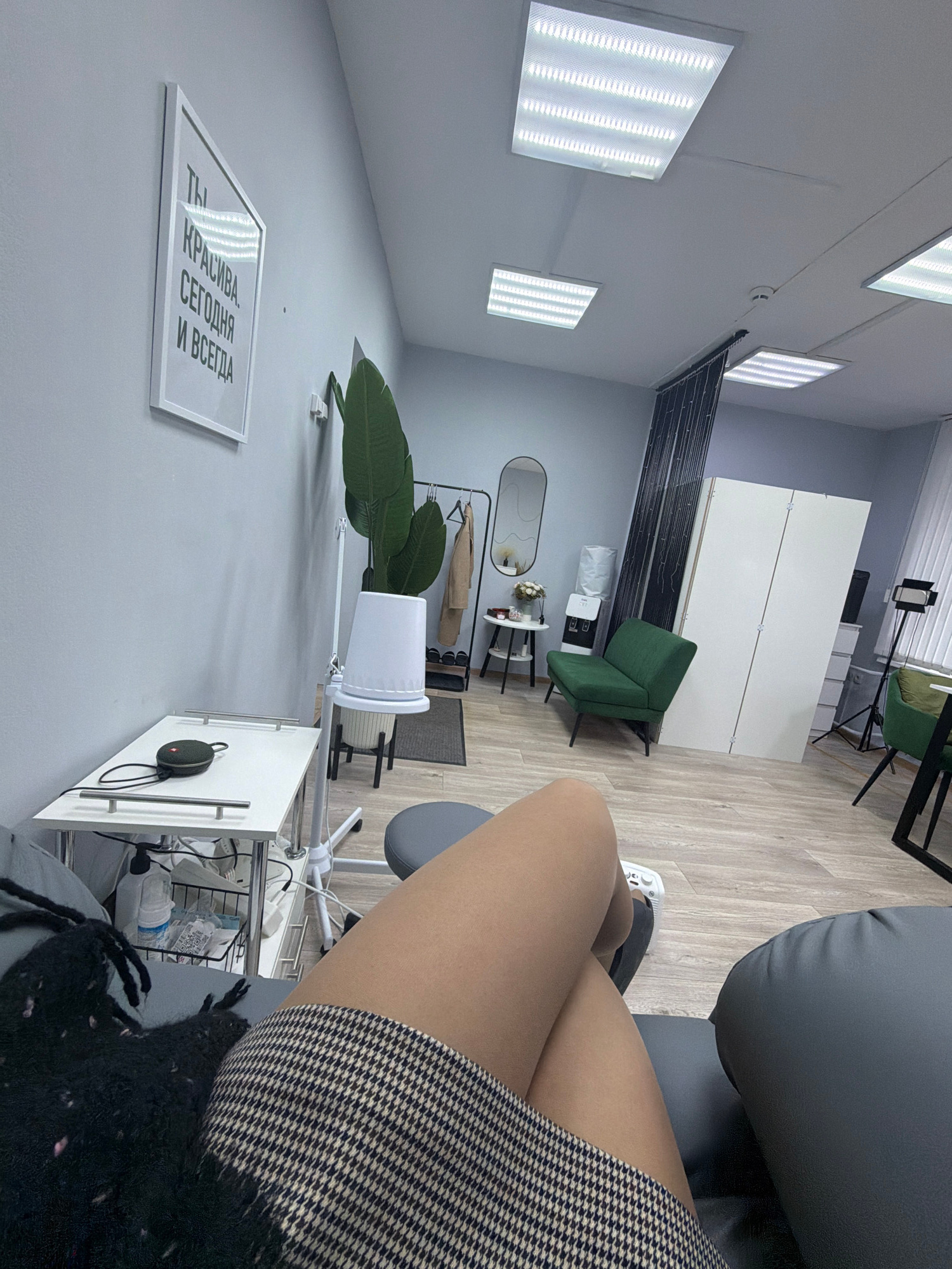 The image depicts an interior scene with a partial view of a person seated in what appears to be a salon or studio. The foreground features the legs of an individual wearing a houndstooth-patterned sk…read more