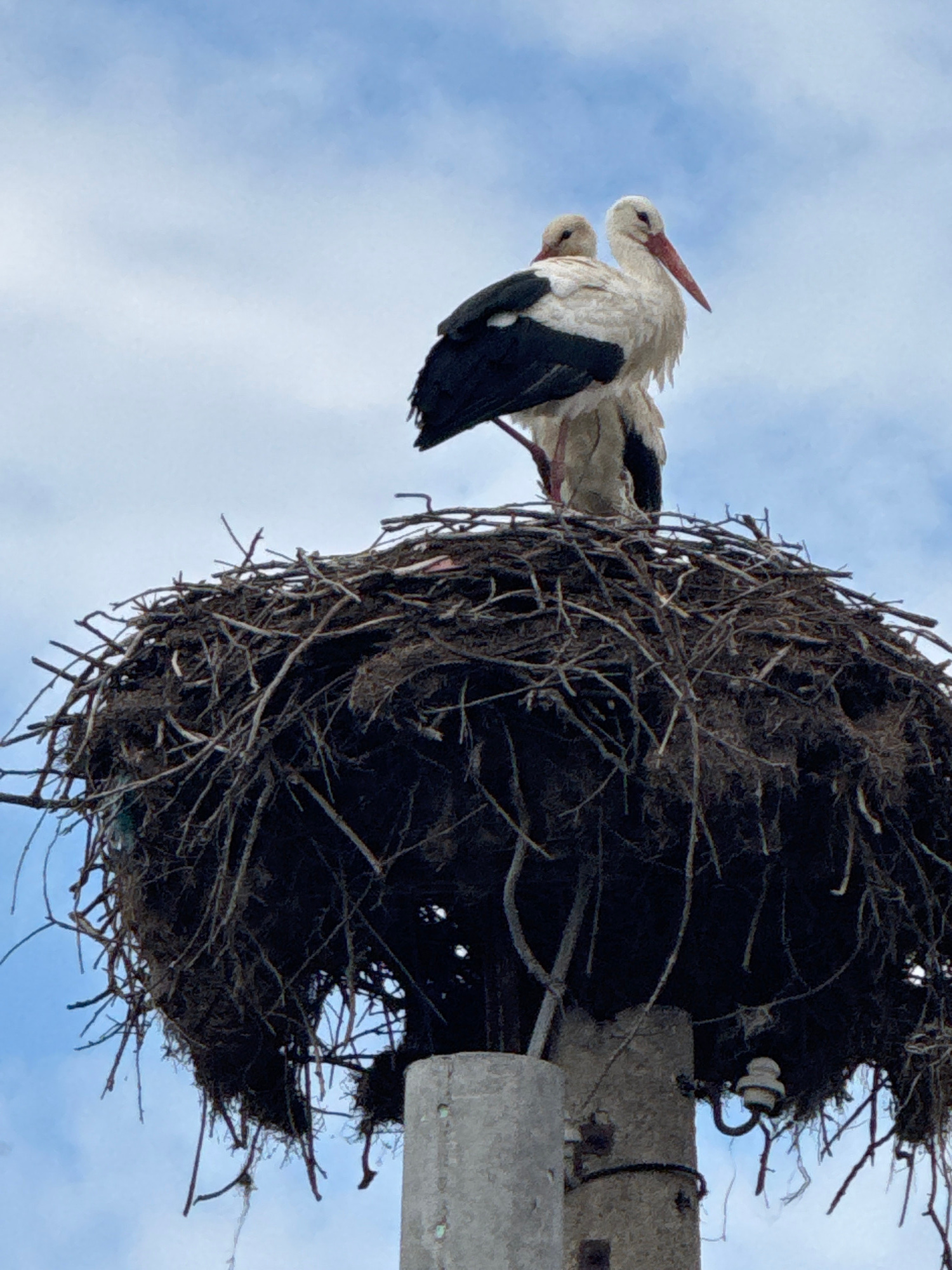 Two white storks with black wings stand in a large nest made of twigs on top of a concrete utility pole. The nest is located in Tutrakantsi, Bulgaria. The sky is blue with white clouds in the backgrou…read more