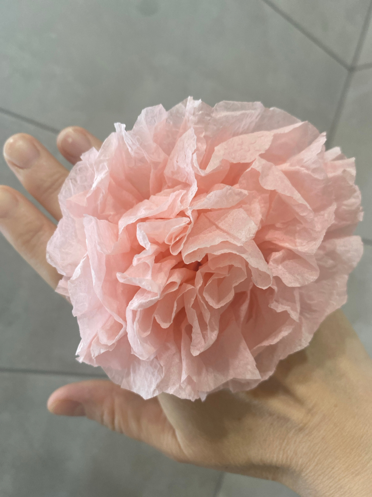 A hand holds a pink paper flower against a light gray tiled background. The hand is light-skinned and partially obscured by the flower. The flower is large and composed of multiple layers of delicate,…read more