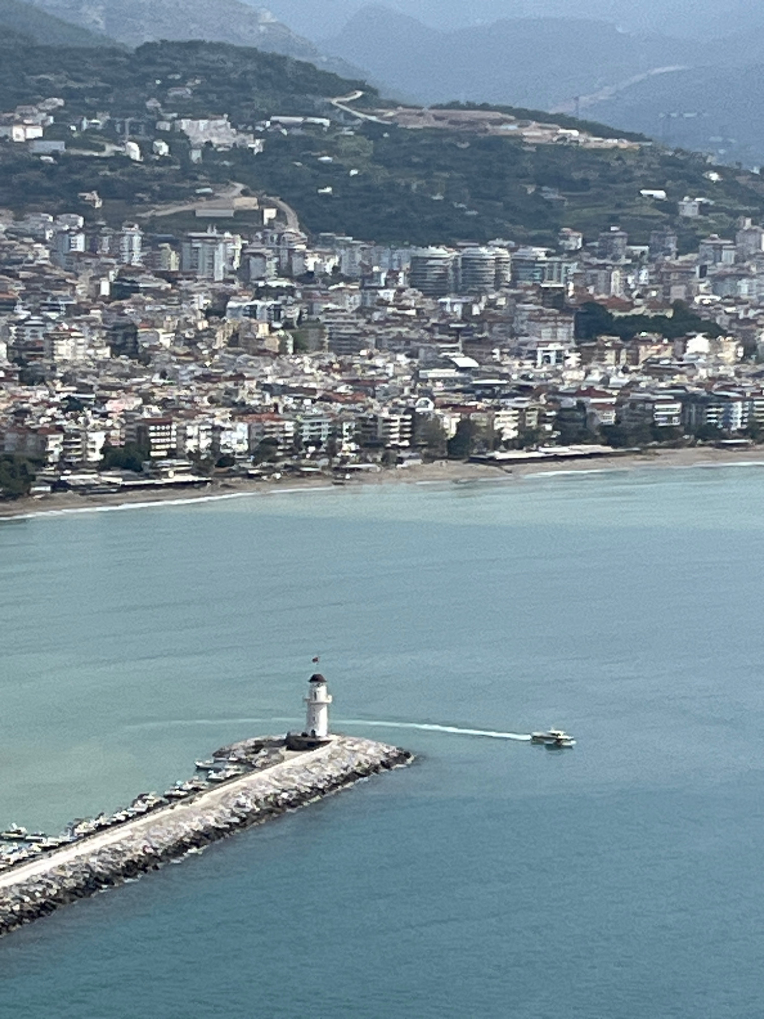 An elevated, distant view depicts the coastal city of Alanya, Turkey, under a clear sky. The foreground features a calm, turquoise-blue sea. A prominent stone breakwater extends from the left into the…read more