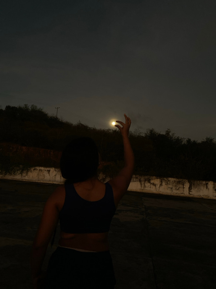 The image displays an outdoor scene in Juan Griego, Venezuela, captured under low light conditions, indicative of dusk or night. A person, observed from the rear and largely silhouetted, stands in the…read more