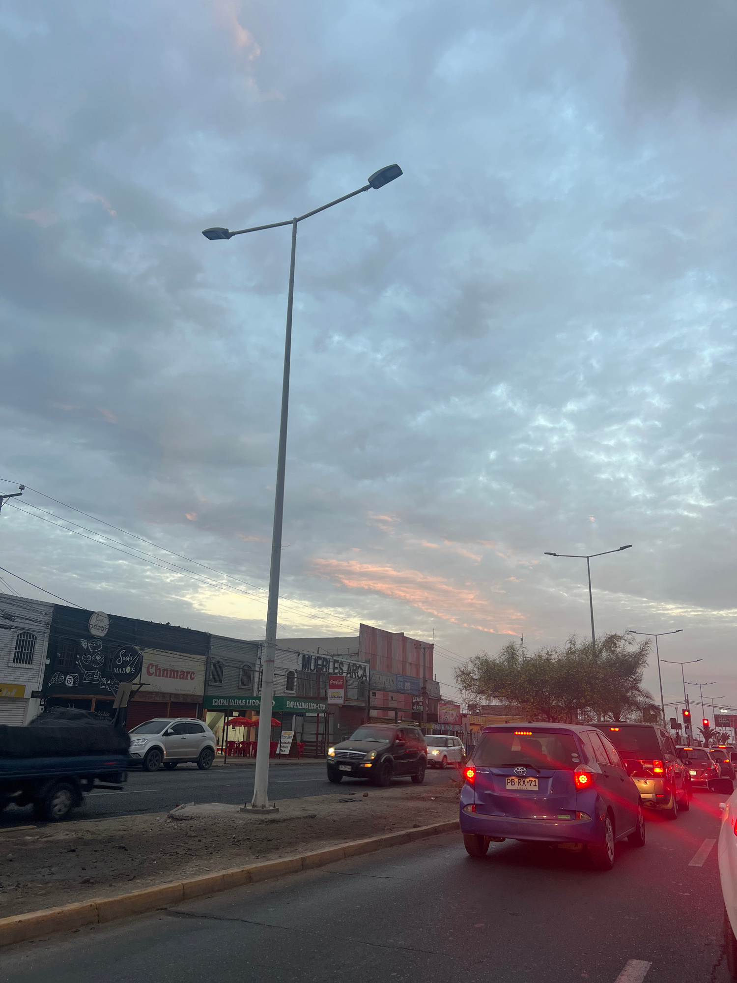 Here is a detailed description of the image: The image shows a congested street scene in Arica, Chile, at dusk. The focus is on the traffic in the right foreground, consisting of several cars stoppedβ¦read more