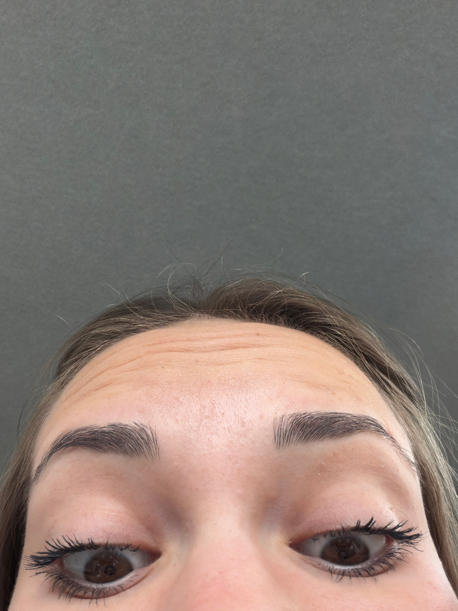The image shows a close-up view of a woman's face, rotated such that the top of her forehead is at the top of the frame. The person has light skin, brown eyes, and meticulously groomed eyebrows. She iā¦read more