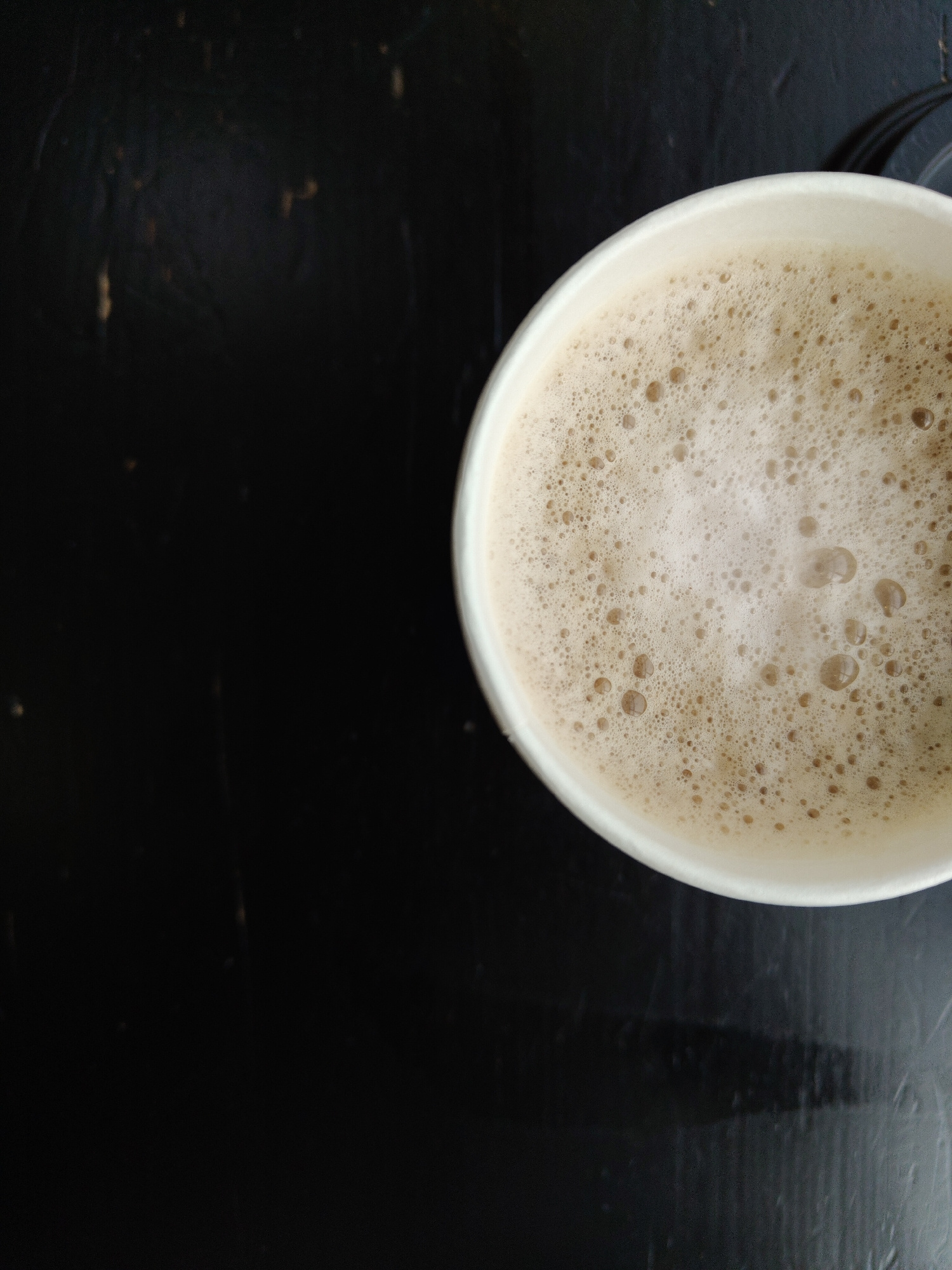 A top-down, close-up shot shows a white paper cup filled with a light brown, frothy beverage, likely a latte or cappuccino. The cup is positioned on the right side of the frame. The background is a da…read more