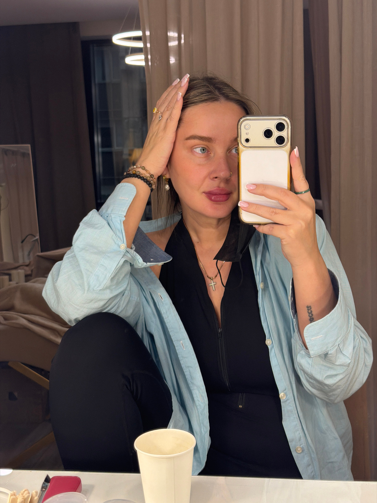 A fair-skinned woman is taking a selfie in a mirror. She is wearing a black top, black pants, and a light blue, button-down shirt. The woman has blonde hair and is wearing rings and bracelets. She is…read more