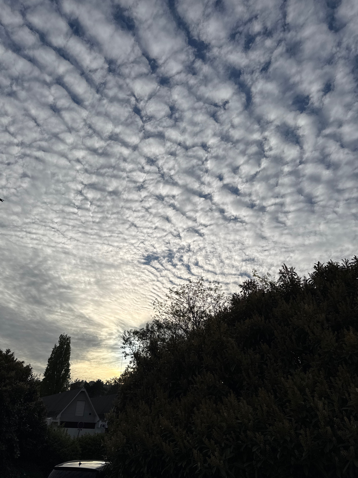 The image depicts a view of the sky in Orsay, France. The sky is filled with altocumulus clouds, characterized by their small, rounded masses arranged in rows. The color of the sky ranges from white t…read more