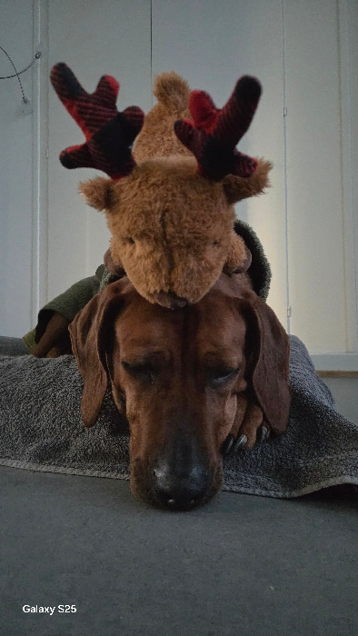 A brown dog lies resting, its head on a gray towel. A stuffed moose toy with red and black plaid antlers rests near its head, seemingly leaning against it. The dog's eyes are closed, and its long ears…read more
