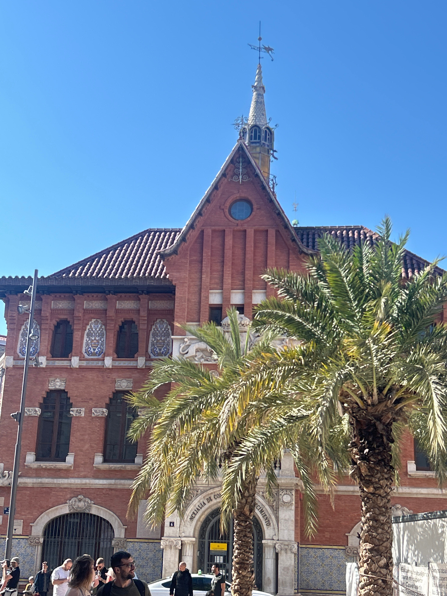 This image captures the facade of a building in Valencia, Spain, featuring brick architecture and a prominent palm tree. The building includes notable details such as arched windows, intricate tile pa…read more