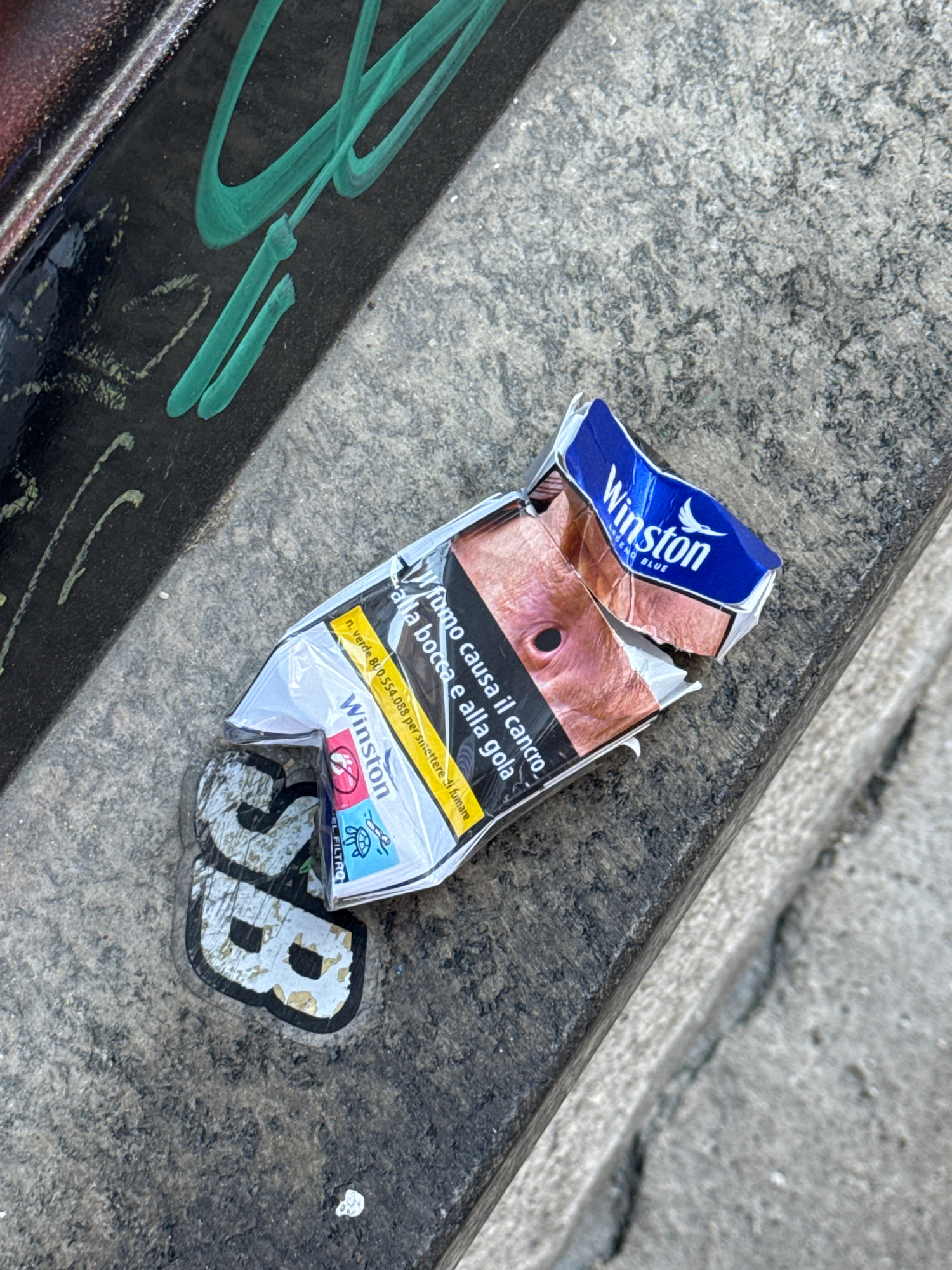 The image shows a discarded and crushed Winston cigarette pack lying on a weathered, grey surface, possibly concrete or stone. The pack is torn open, revealing a graphic image of a person's face damag…read more