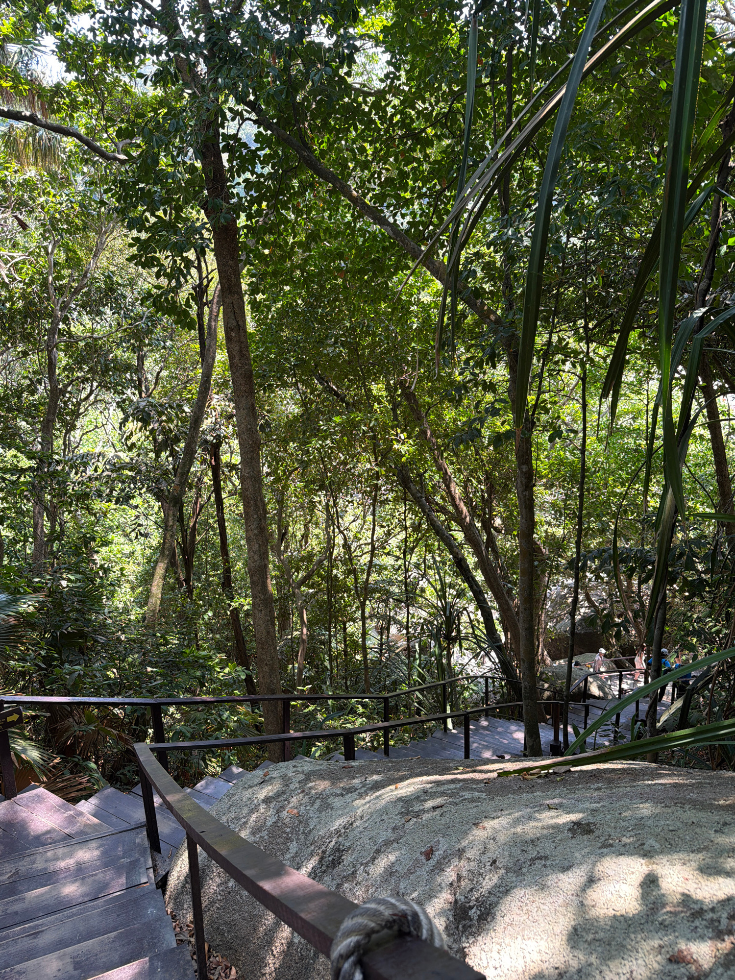 The scene depicts a downward-sloping wooden staircase with dark metal handrails in a dense tropical forest environment, located in Lam Kaen, Thailand. The staircase curves slightly to the left, with i…read more