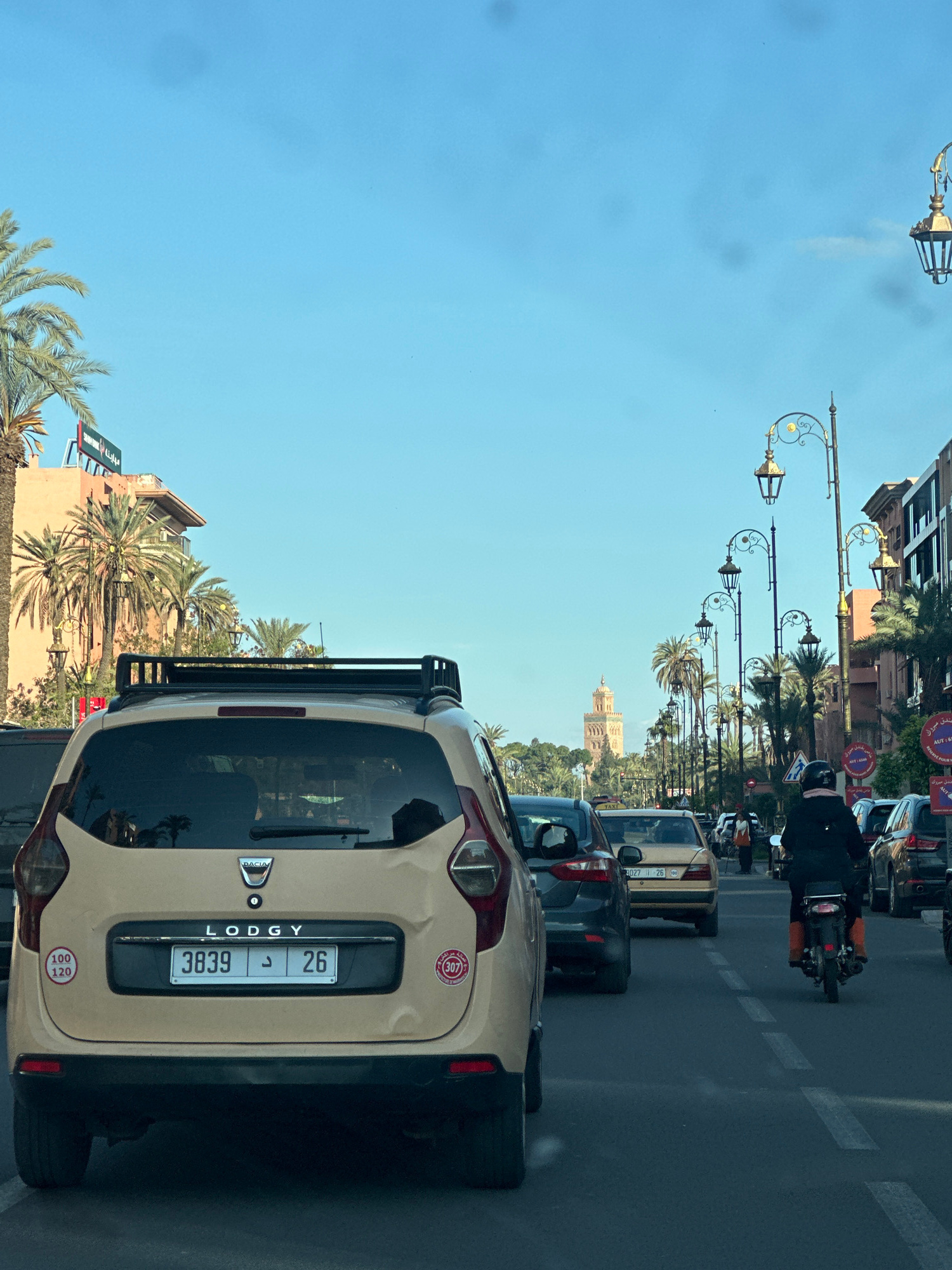 The image captures a street scene in Marrakesh, Morocco, characterized by traffic and urban elements. A beige Dacia Lodgy taxi with license plate "3839 J 26" is prominently positioned in the foregroun…read more